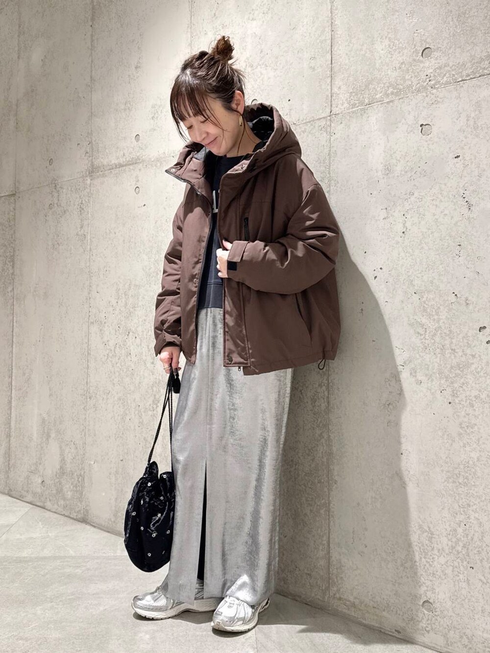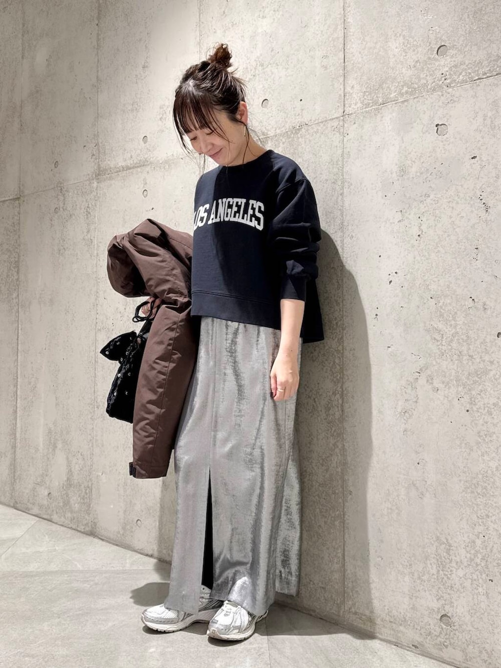 今回は、グリッターロングスカートをアクセントにした、大人カジュアルコーディネートです。