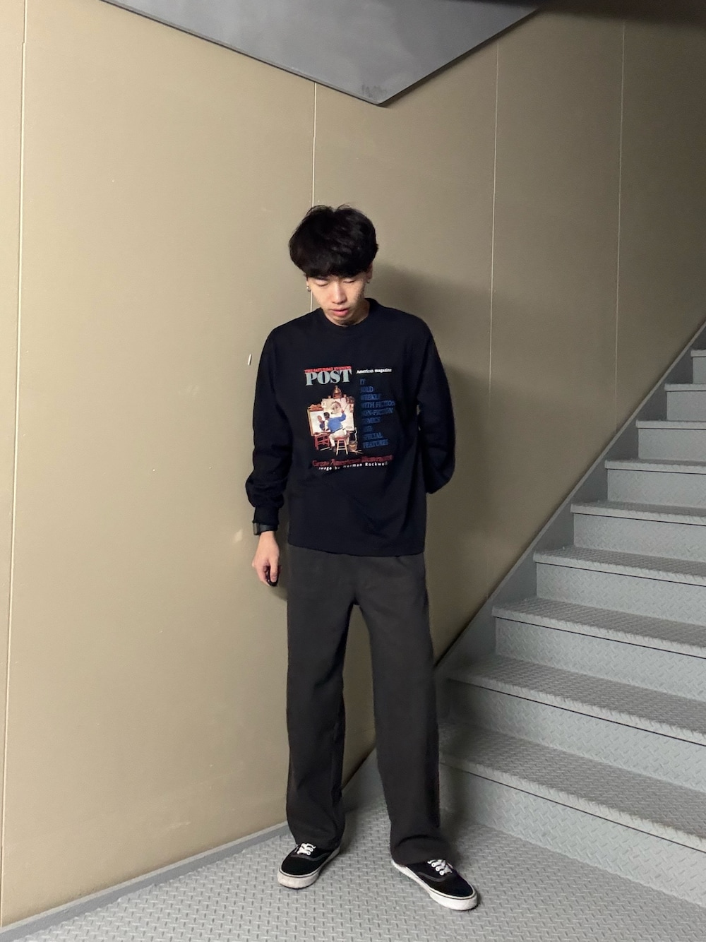 爽やかなブルーのストライプシャツに、クリームカラーのワイドパンツを合わせたクリーンなカジュアルコーデ。足元はVANSで抜け感をプラスし、キャップでほどよくストリート要素を取り入れた、都会的なリラックススタイルです。