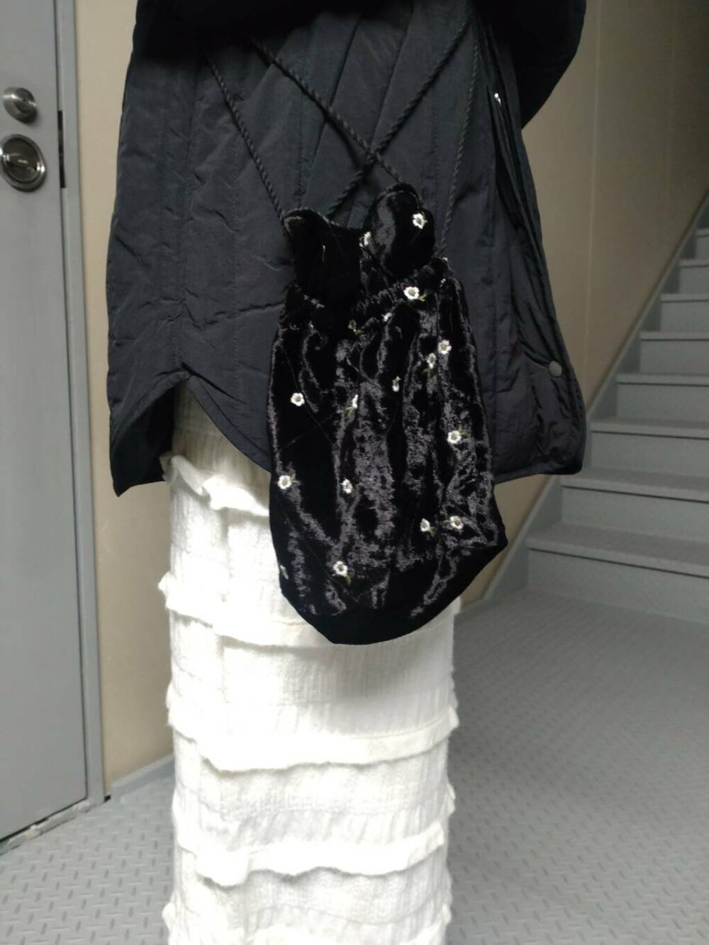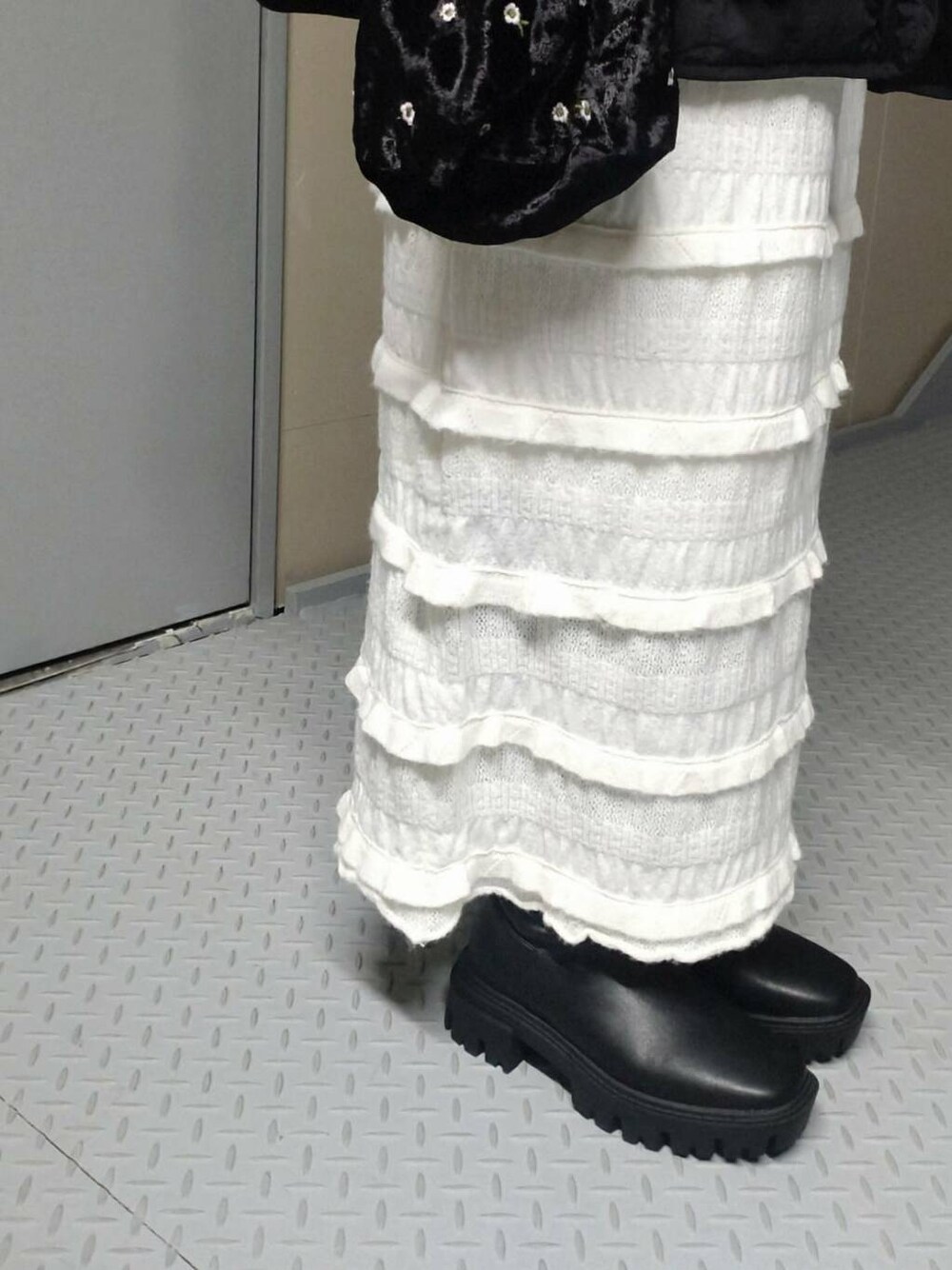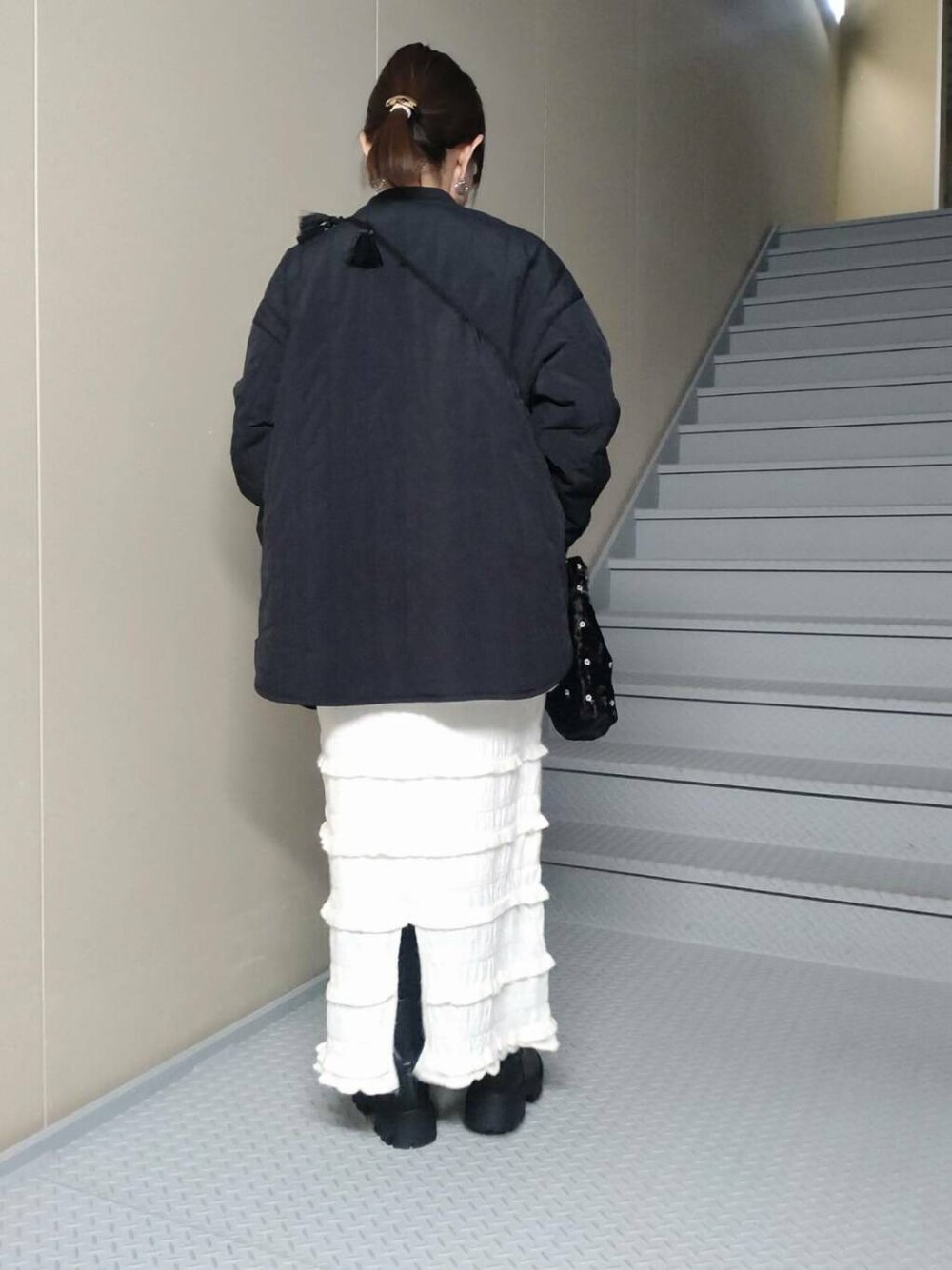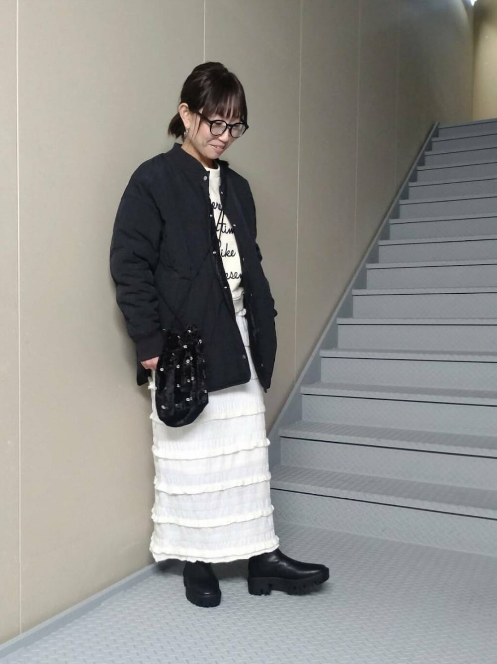 スカートはエクリュを着用していますが、裏地付きなので透け感もきにならず、暗くなりがちな冬のコーディネートのポイントになりますよ。