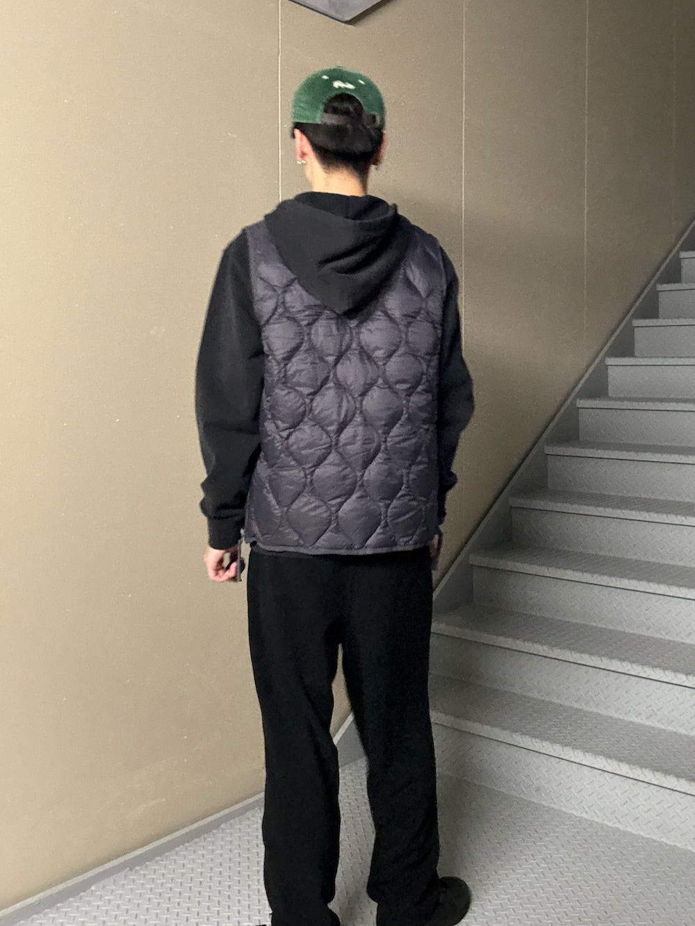 全身をブラックでまとめた統一感のあるスタイリングに、ナイロンベストを重ねて立体感をプラス。