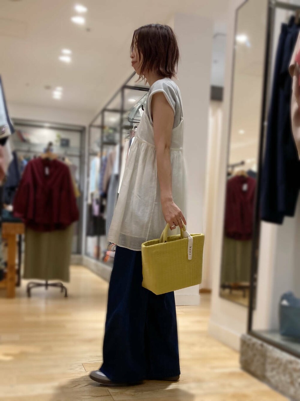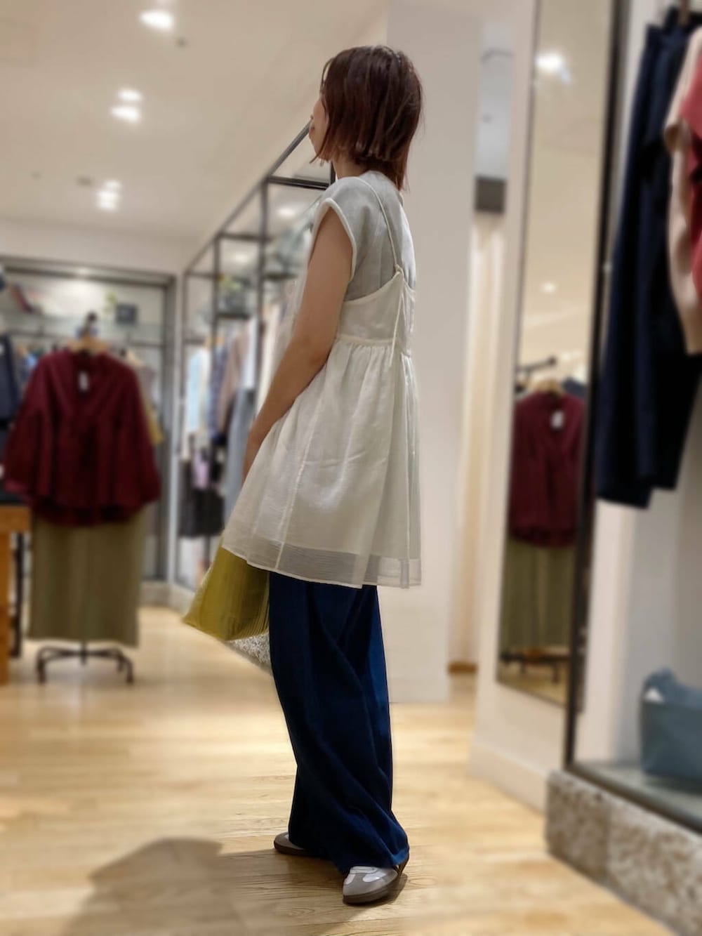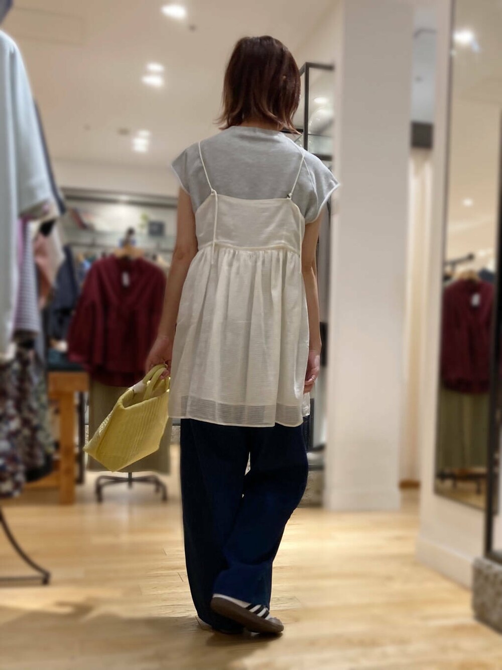 サイズ感:紐で結ぶタイプなので重ねるトップスに合わせてゆるっとさせる事が出来ます。これからの季節は薄手のニットの上から重ねても◎