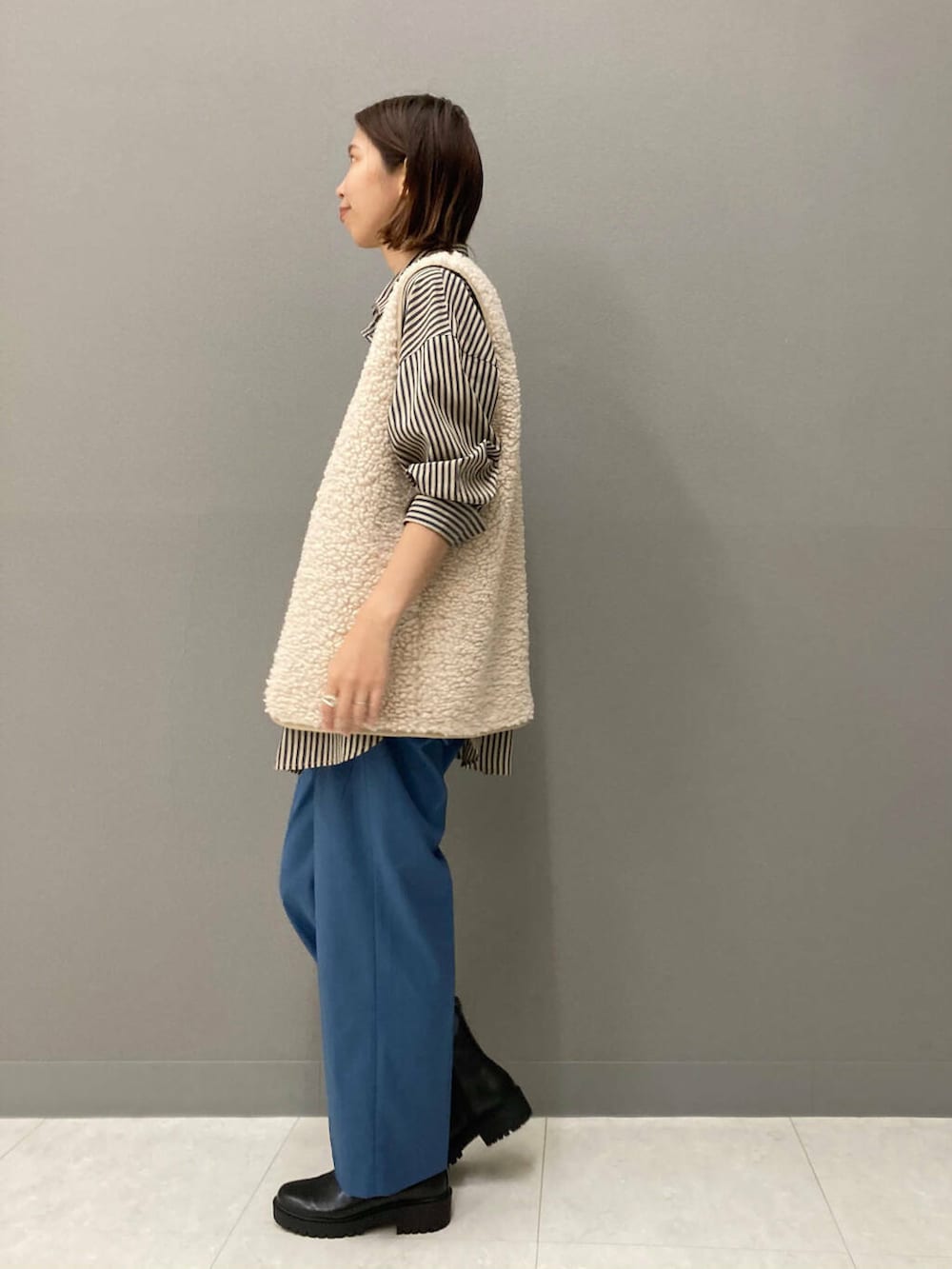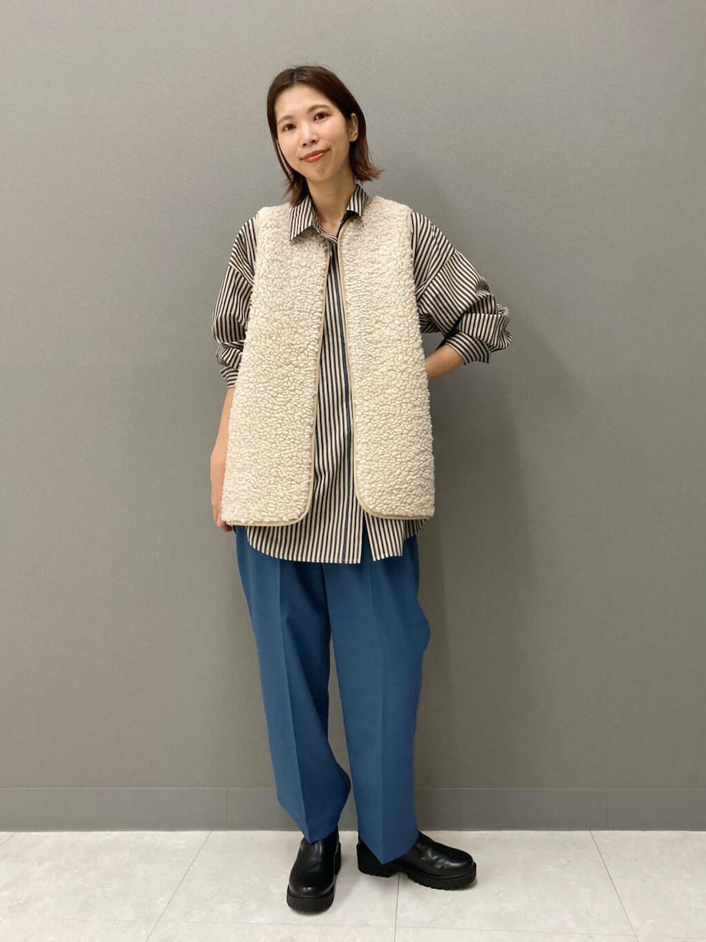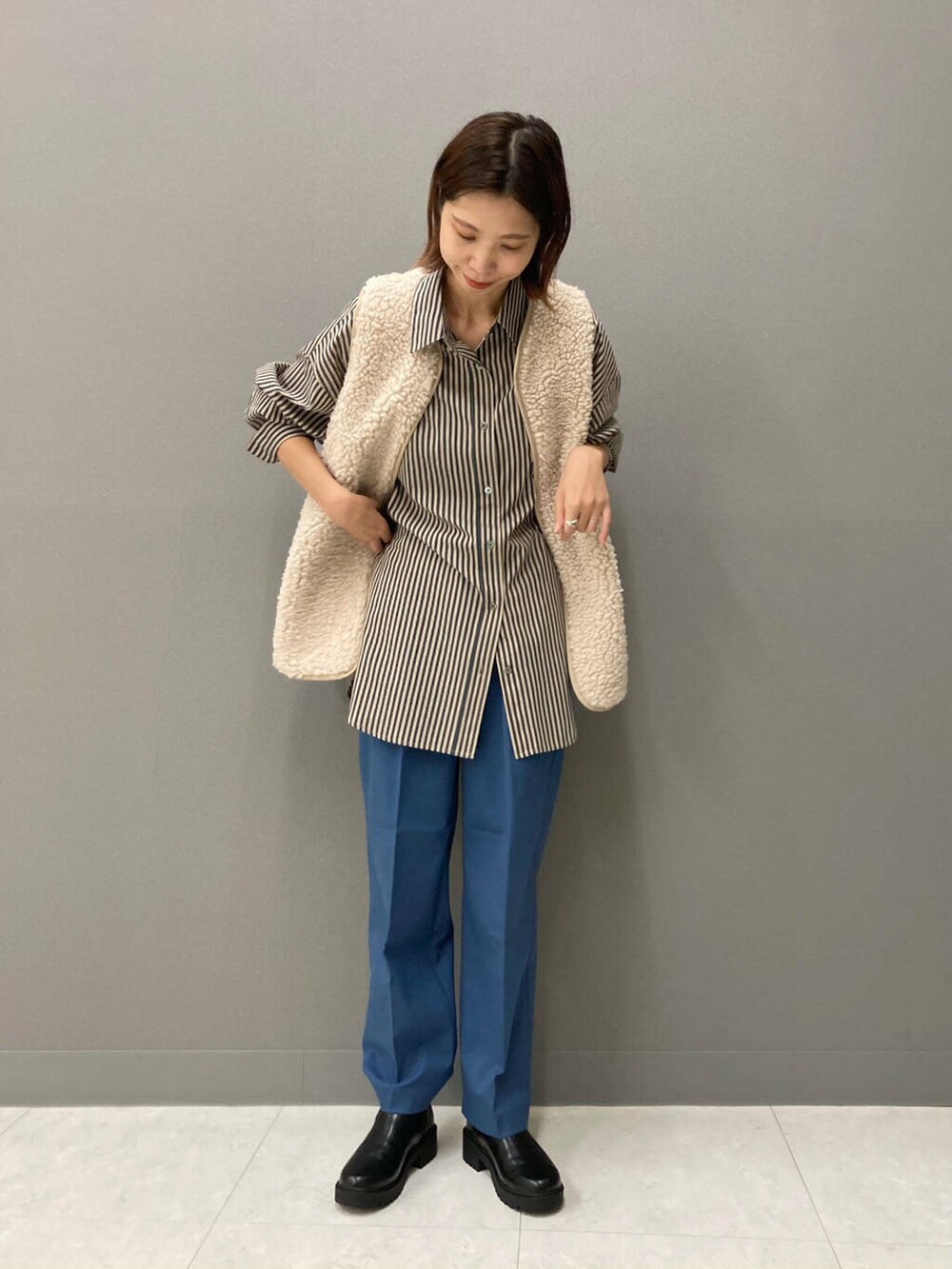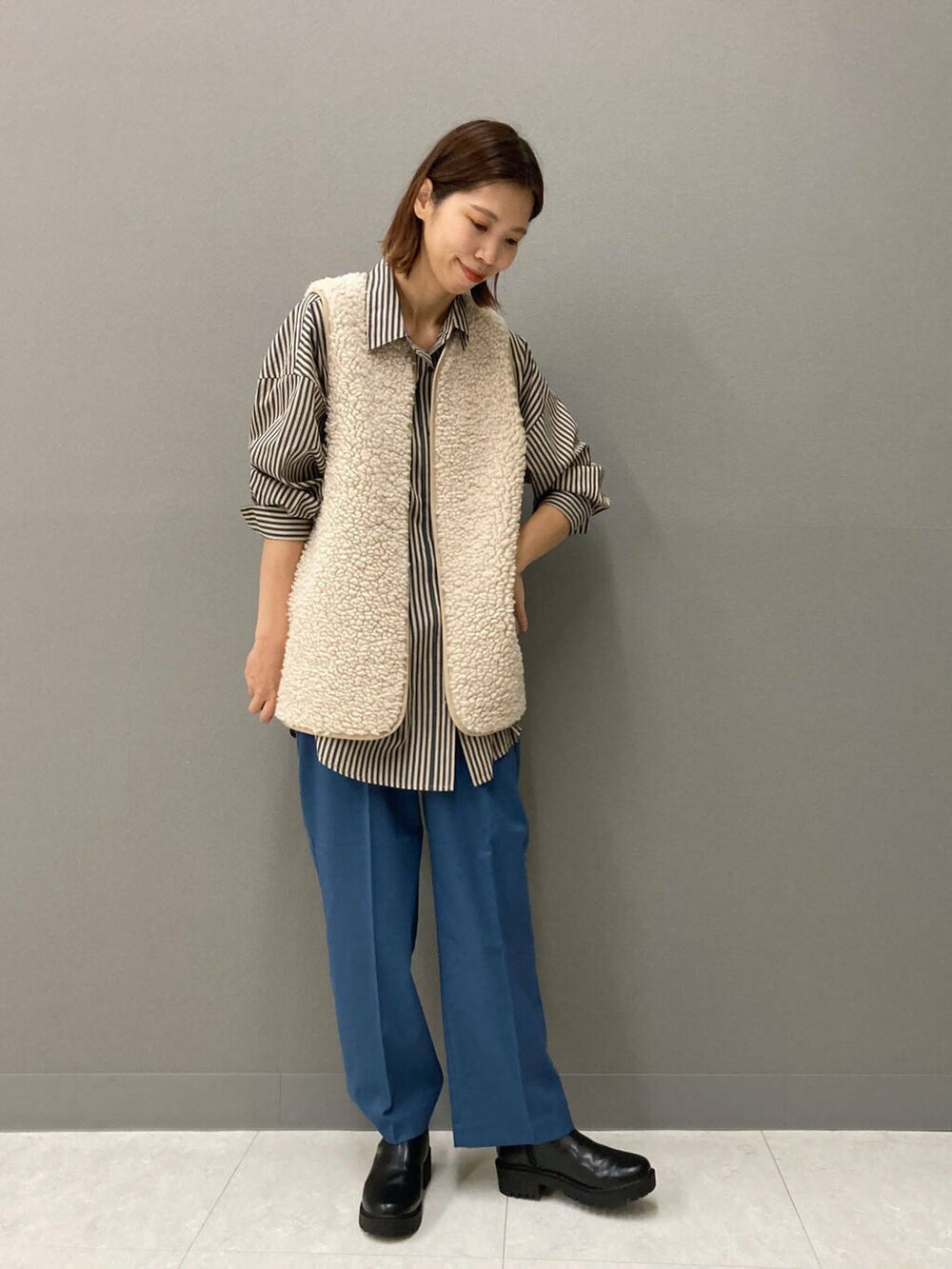 滑らかでつい触ってしまうボアベスト!気温が下がりきらない今の時期、まずはベストから秋の要素を取り入れて暖冬ならではのコーディネートを楽しみましょう(^^)