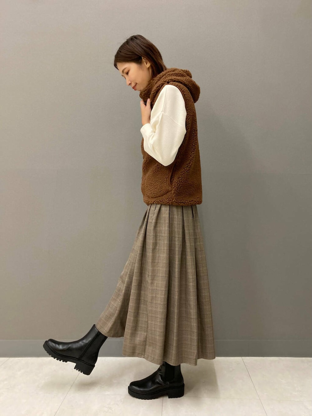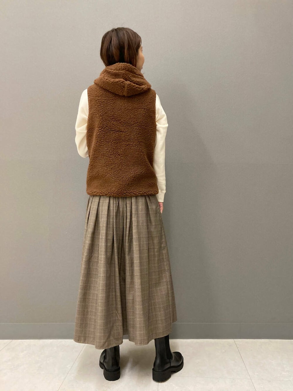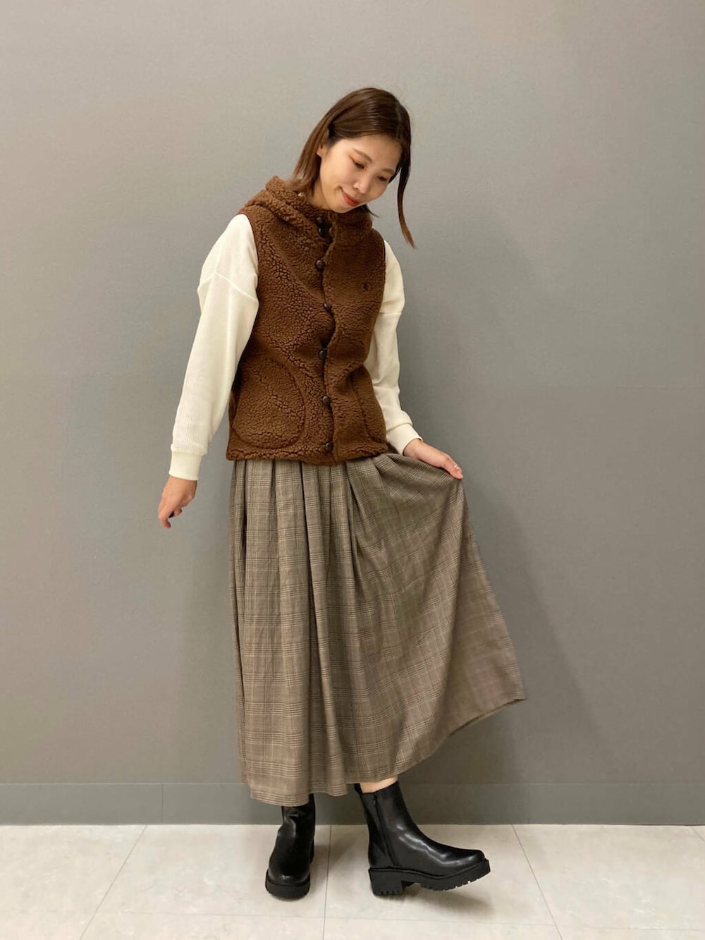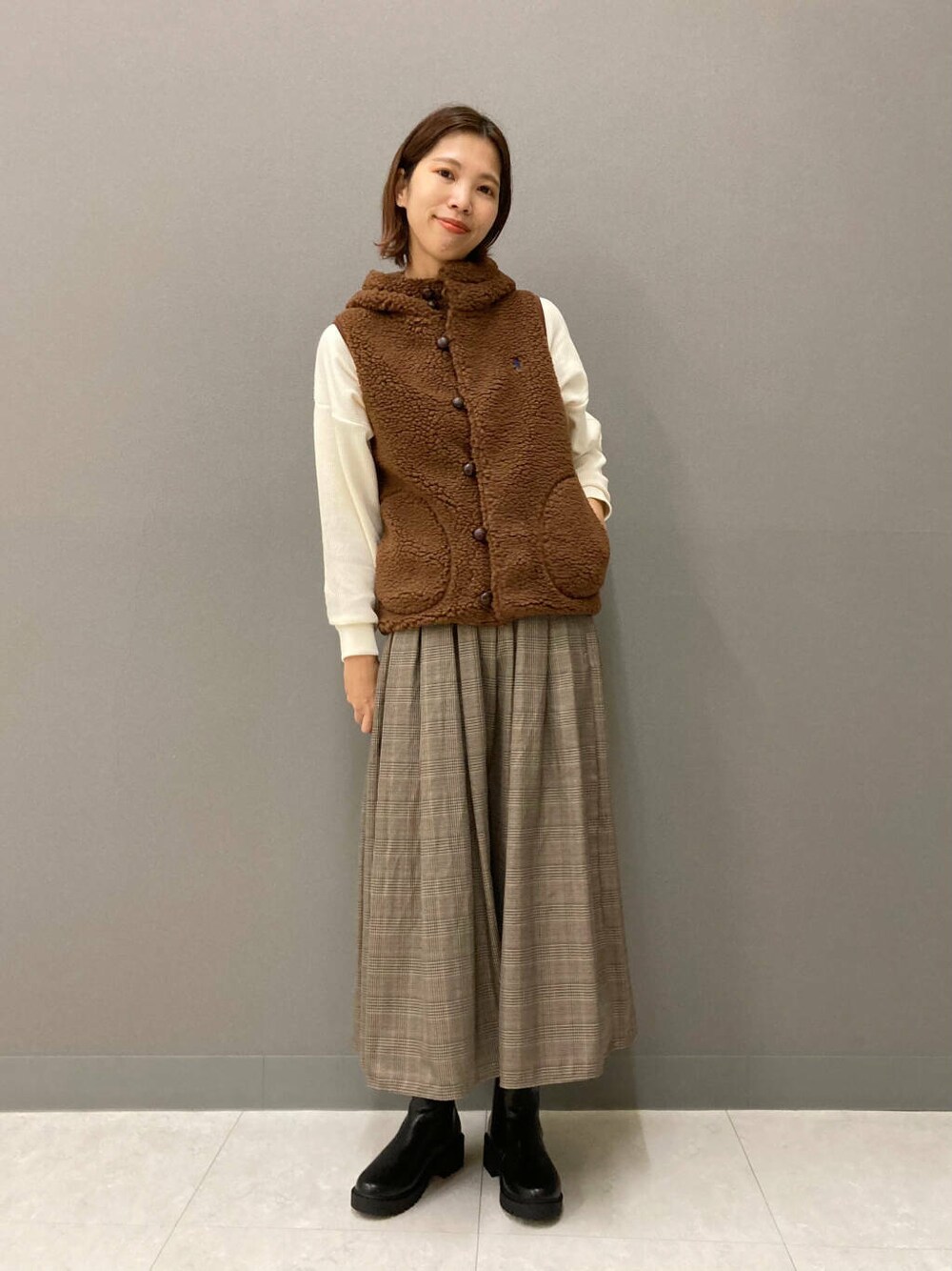 ブラウンのボアベスト、見てるだけでも可愛いですが着ると更に可愛いです!フードのおかげで首周りもぬくぬく。ポケットも付いているのでアウターまでは…という今の時期とっても便利なアイテムです(^^)