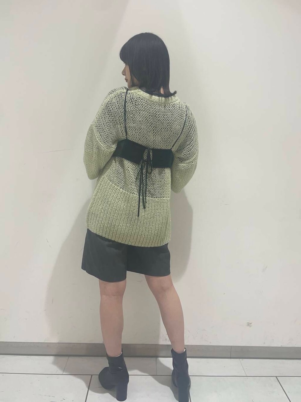 カラーニットにブラックのコルセットを合わせることでスッキリ感プラス🫧