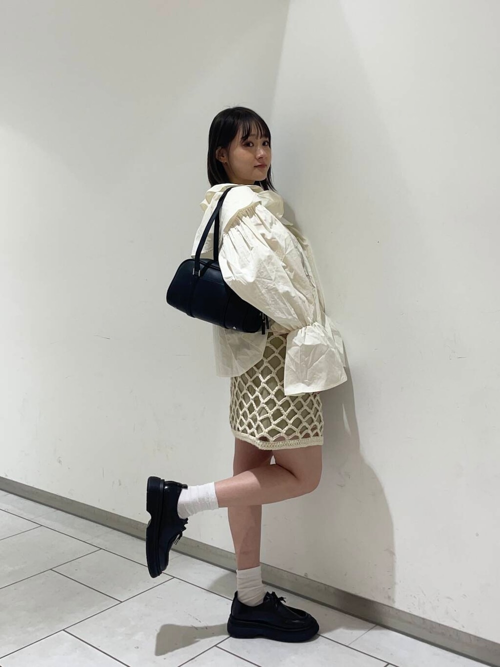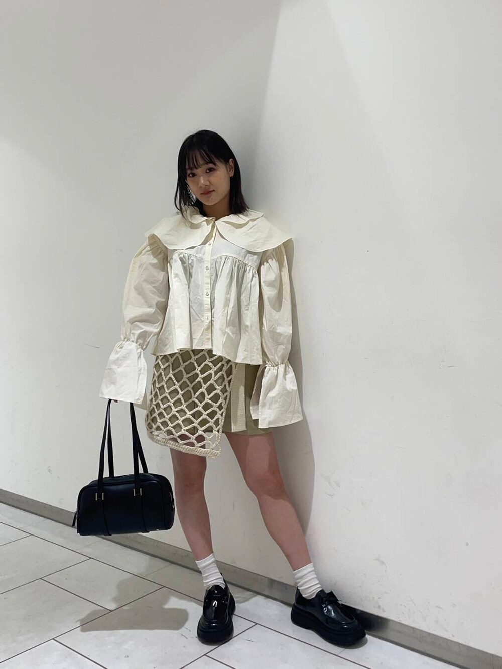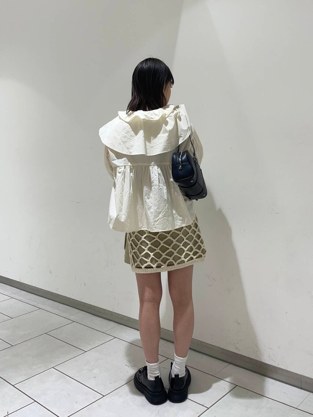 大きな襟が特徴的なアイボリーのブラウスにミニスカートを👗❤️