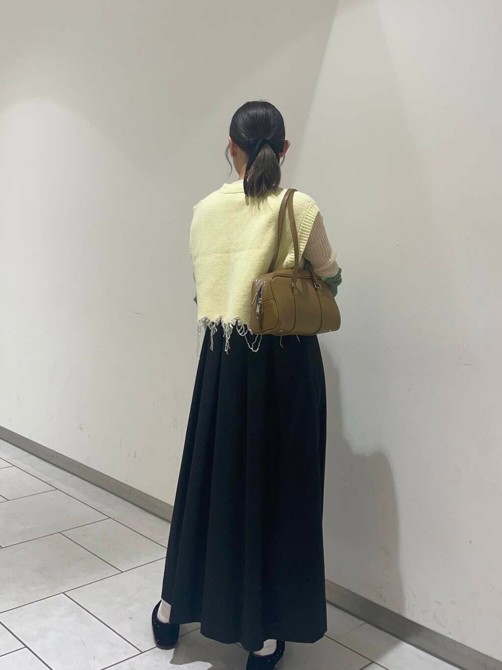 袖のバイカラーが特徴てきなリブニットをインナーとし、ジャンパースカートの上に、ニットベストをプラスしました!!