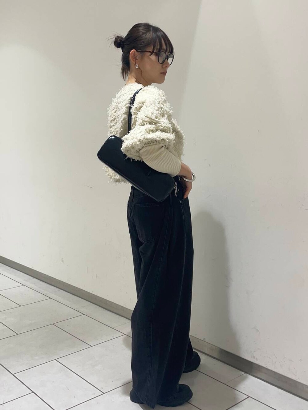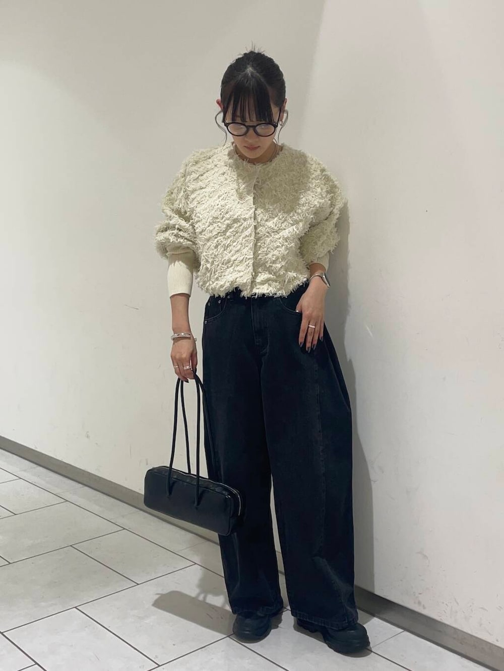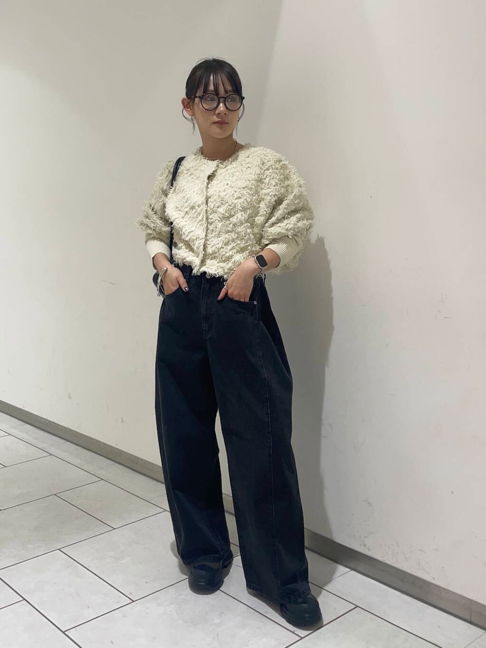 フリンジカーディガンは着丈がスッキリしているので、ゆったりとしたサイドタックデニムを合わせました!