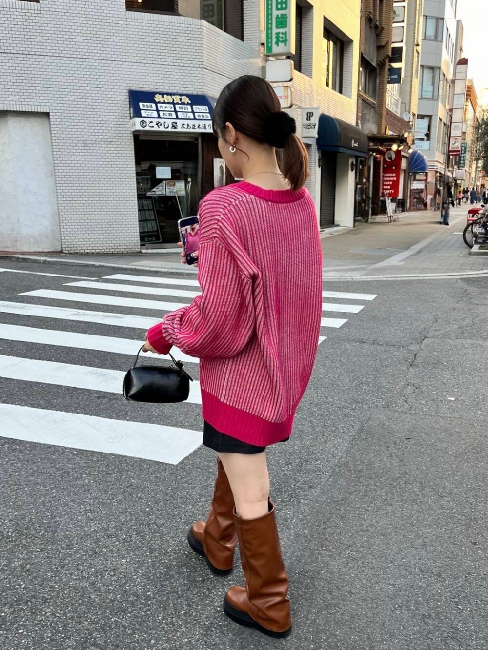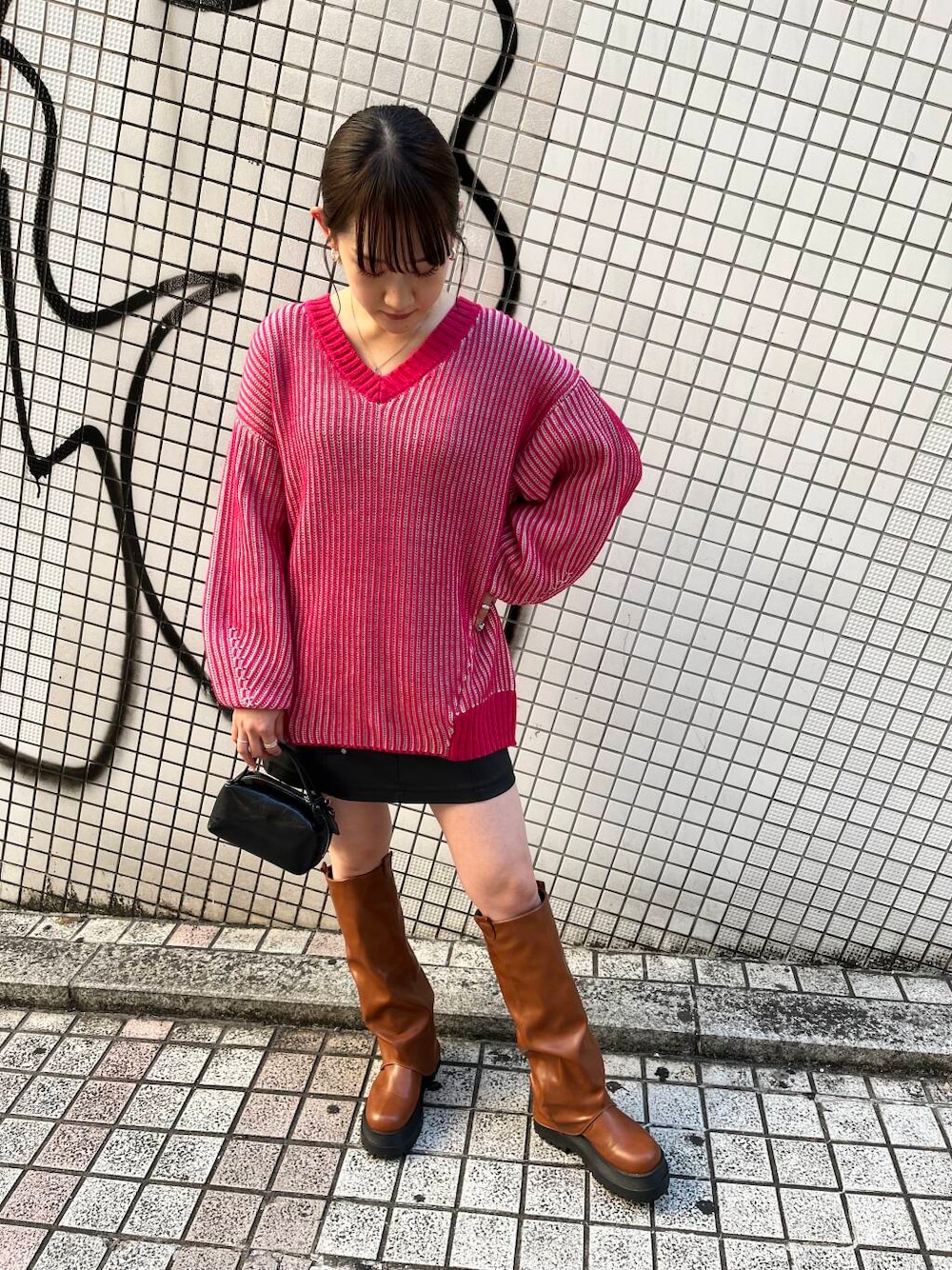 ピンクが目を引くニットはゆったりしていて着やすい◎