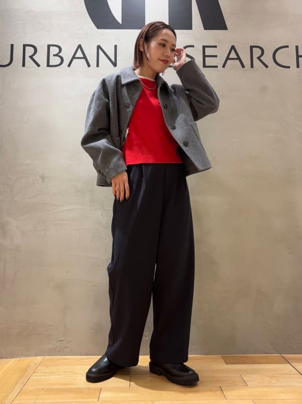 赤ニットにネイビーパンツの王道コーデです!