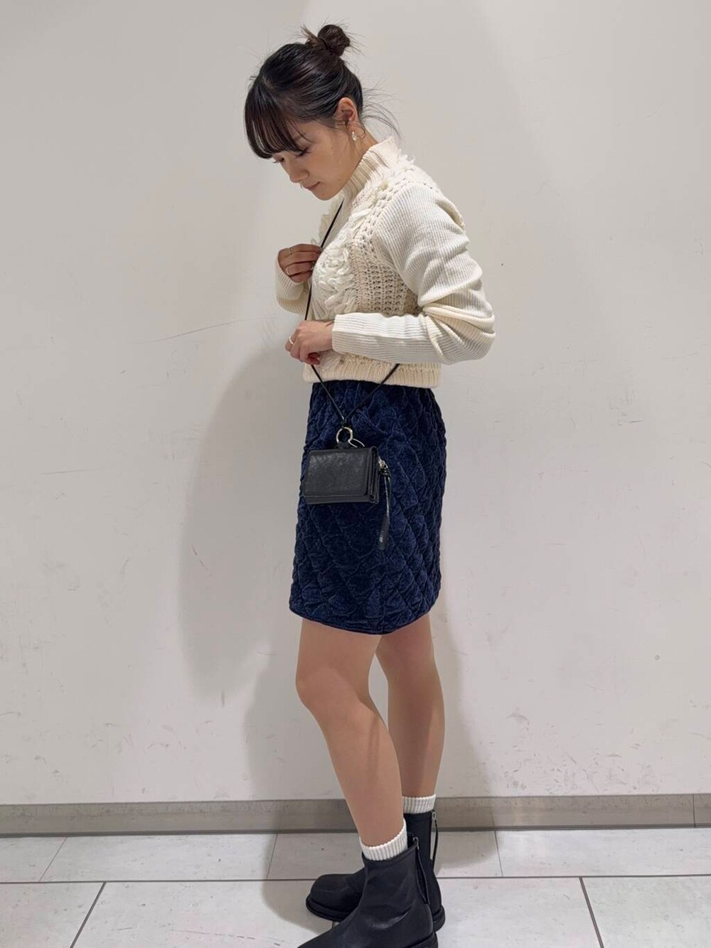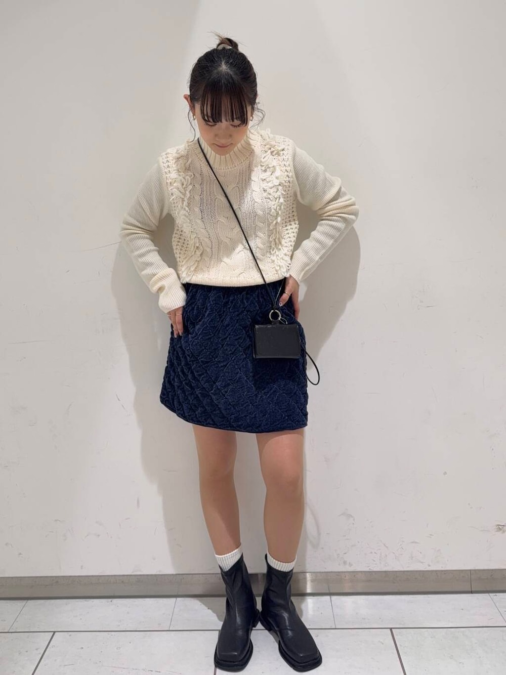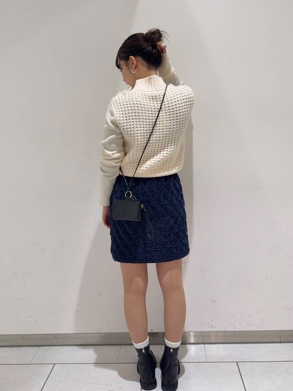 キルティングのミニスカートと合わせる事で冬仕様に☃️