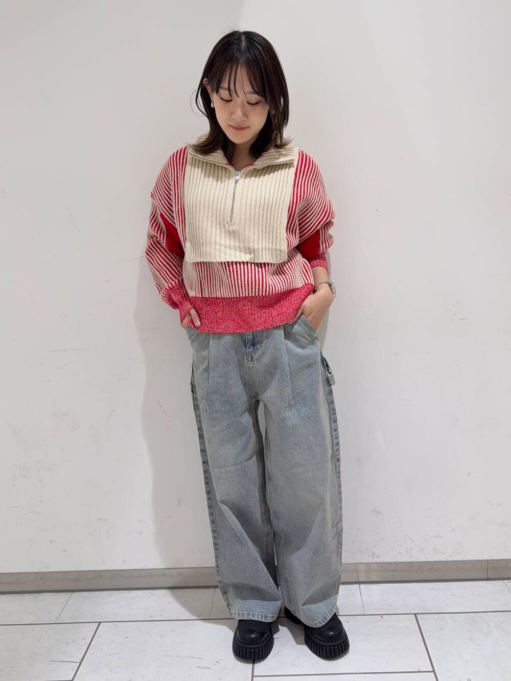 中には赤が目を引くレイヤードニットで、脱いでも可愛い!!