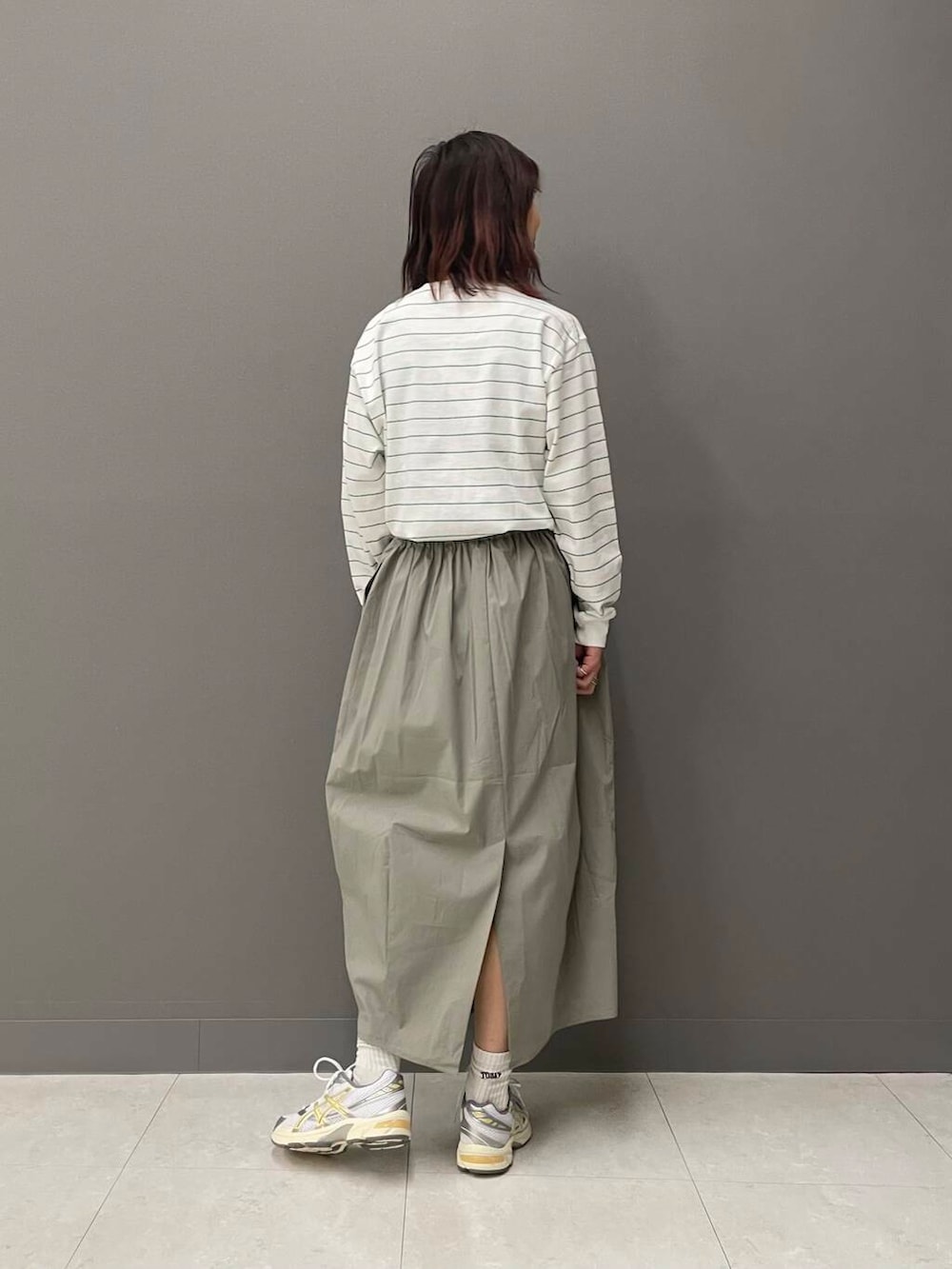 ボリューム感のあるコクーンシルエットは体型を拾いにくく、ただゆったりしているだけではなくバックスリットが女性らしい抜け感を出してくれるのもポイントです!
