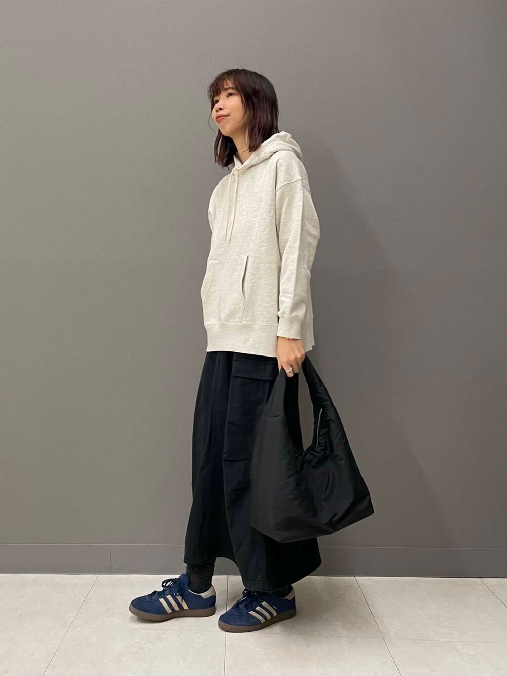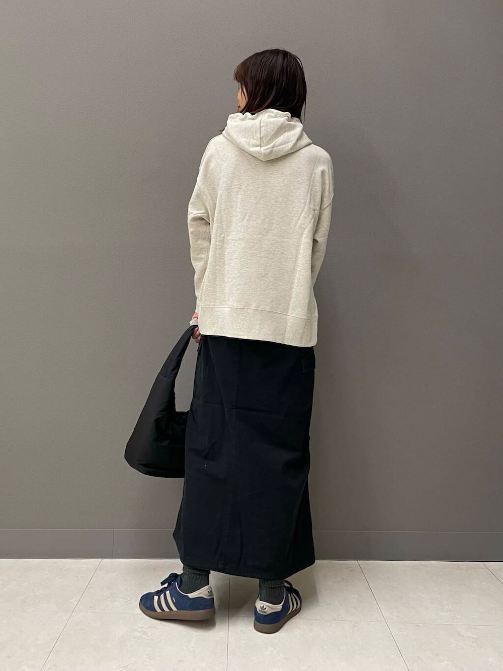 フーディーの紐はリボン結びにしても可愛いですが、1回軽めに絡めて長めに垂らすのが気分です。