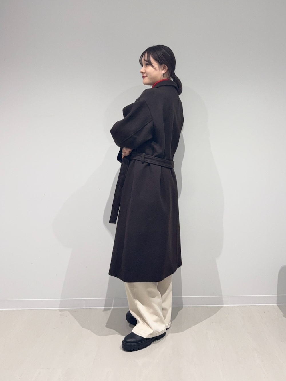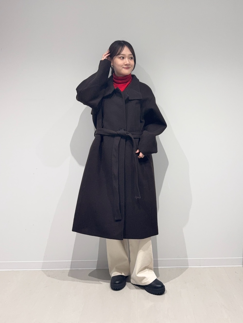 日本製素材のウール100のロングコートはウールなので暖かく、長すぎないのでバランス良く着れます!
