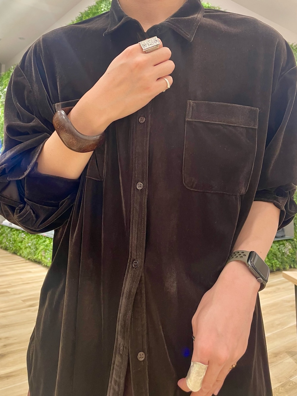 KBFのシアーベロアルーズシャツは落ち感のあるベロアを使用した大人シャツでゆったりとしたサイズ感なので楽に着用可能です✨️