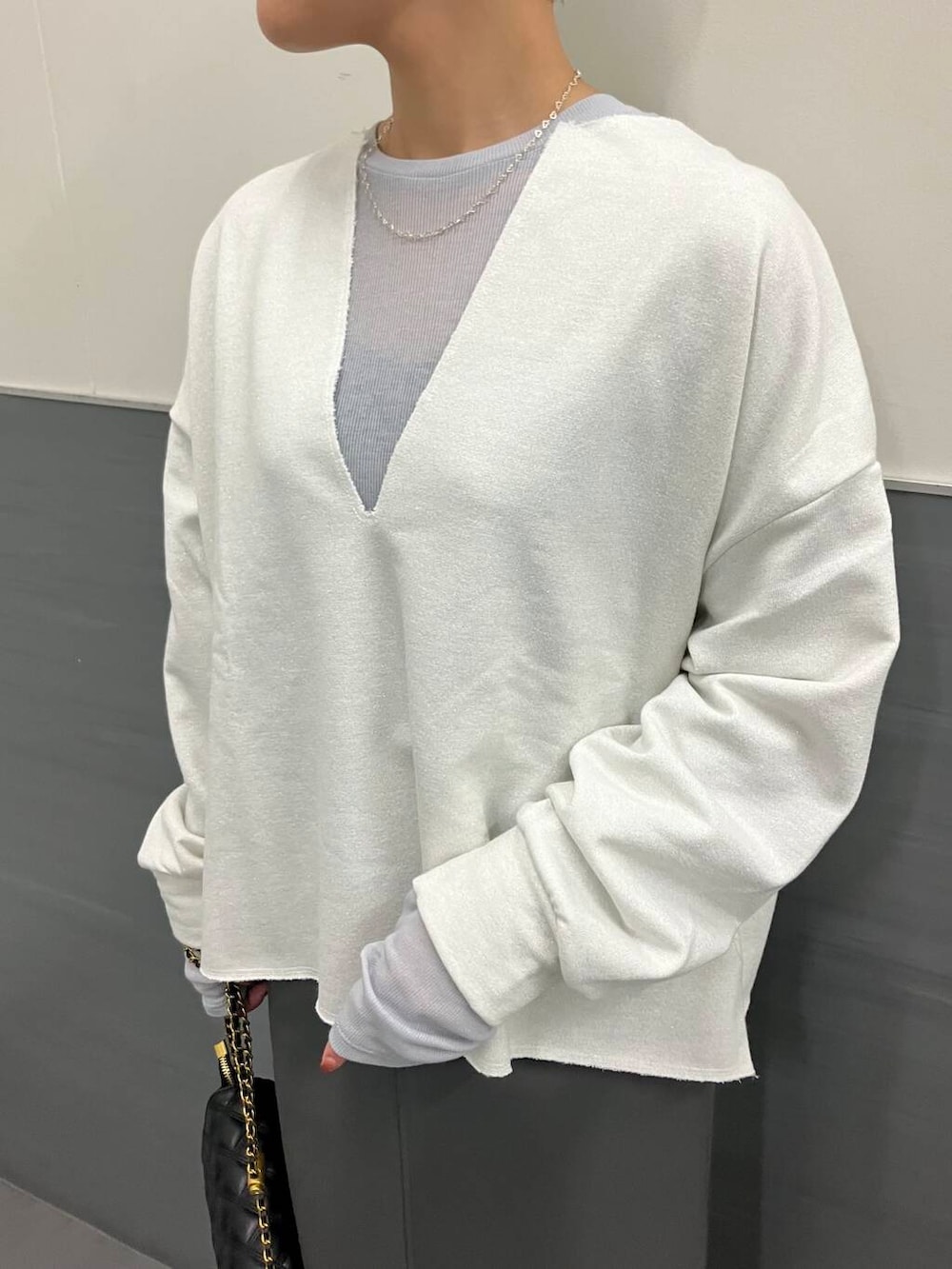 深めのVネックが大人っぽく、