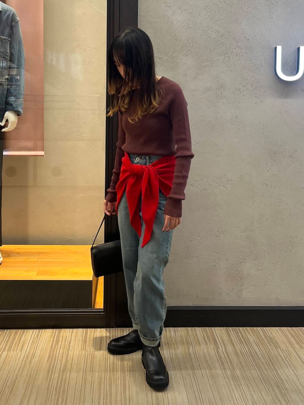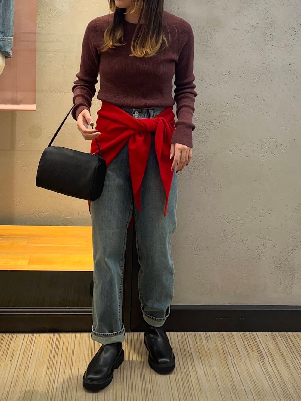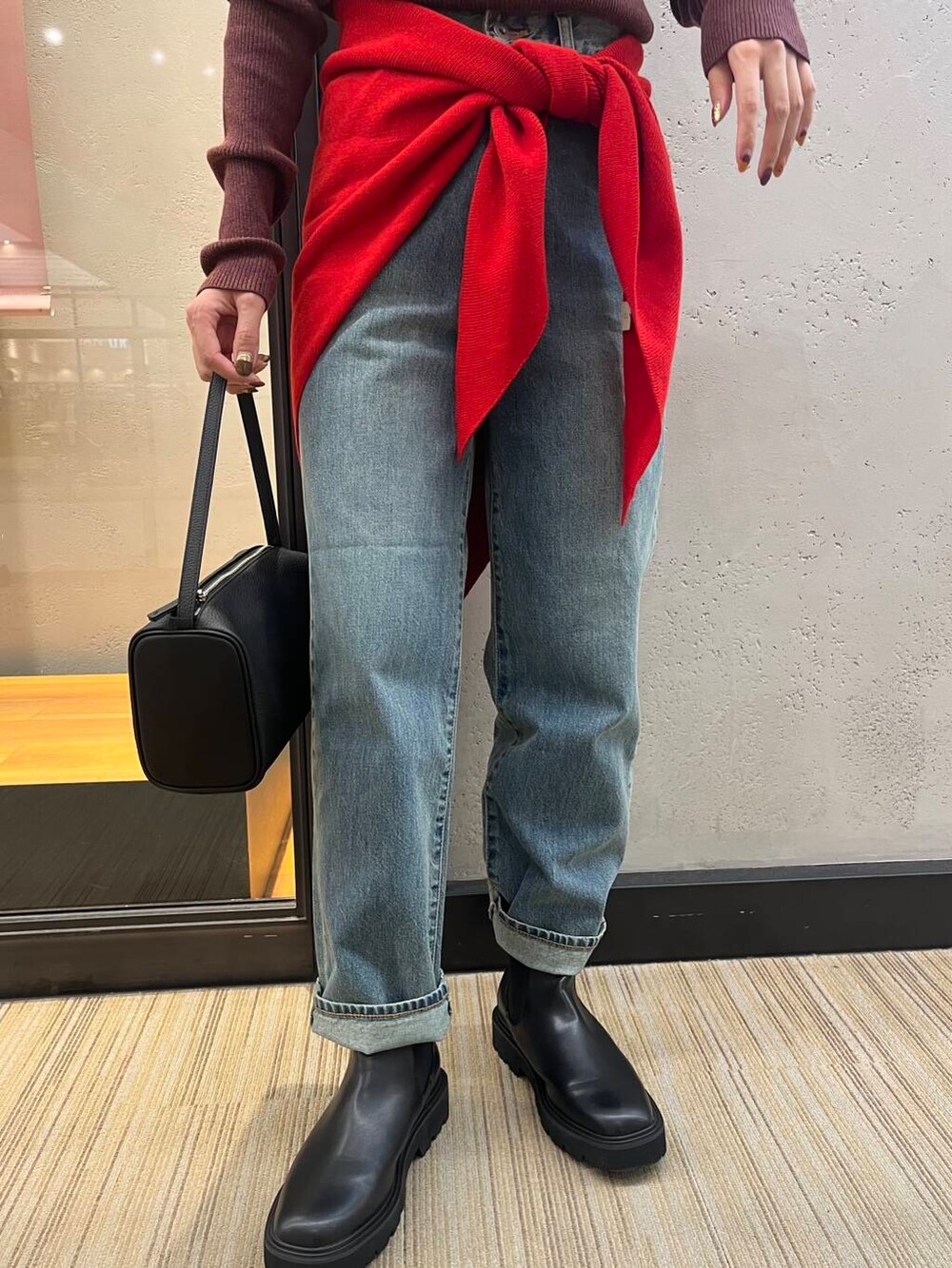デニムのシルエットがスリムであるため、ゴツめのブーツと合わせるととても可愛いです!!