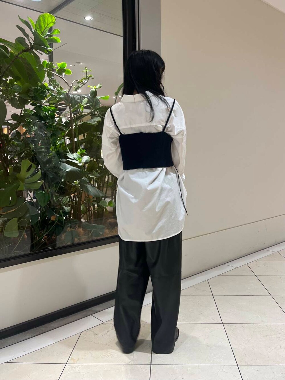 ストレッチの効いた素材で、シルエットはトレンド感を押さえたカーブシルエット。ウエストはゴム仕様で紐で調整も可能です🙆♀️