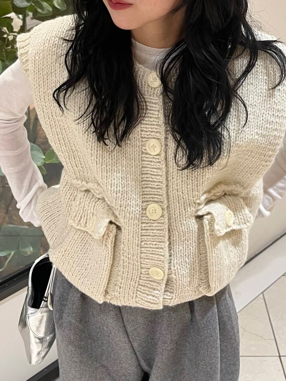 ざっくりとした編地で、立体感のあるポケットがアクセントになったかわいい1枚🧶