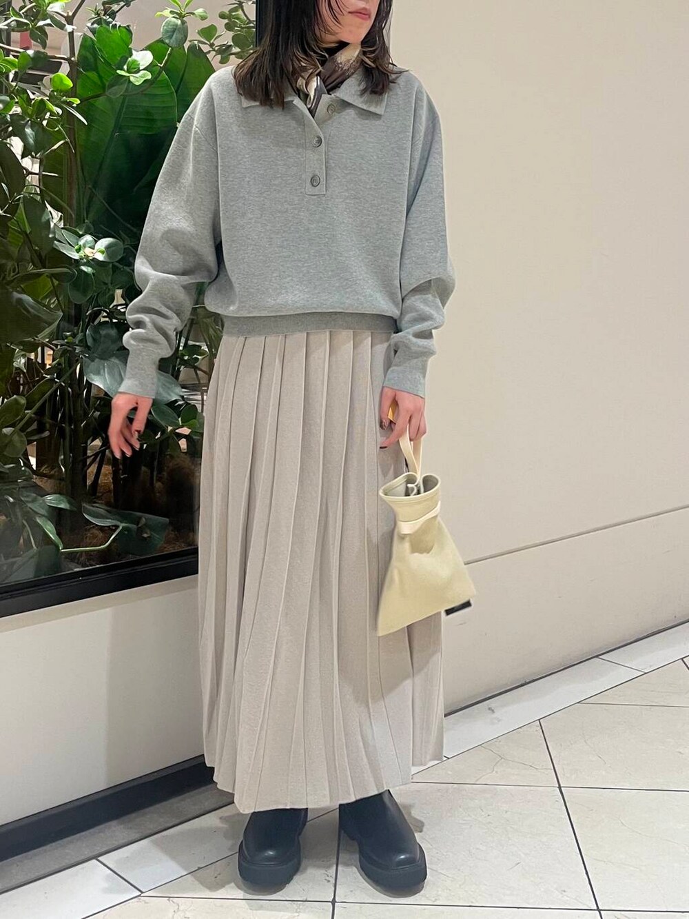 春の新作であるスウェットライクシャツカラーニットのボタンを少し開けて、スカーフを首元に巻いてみました✨