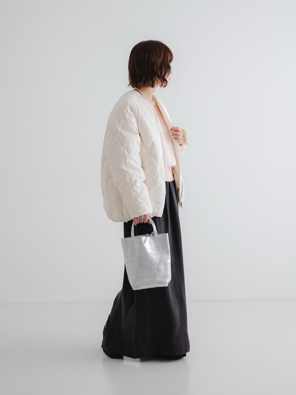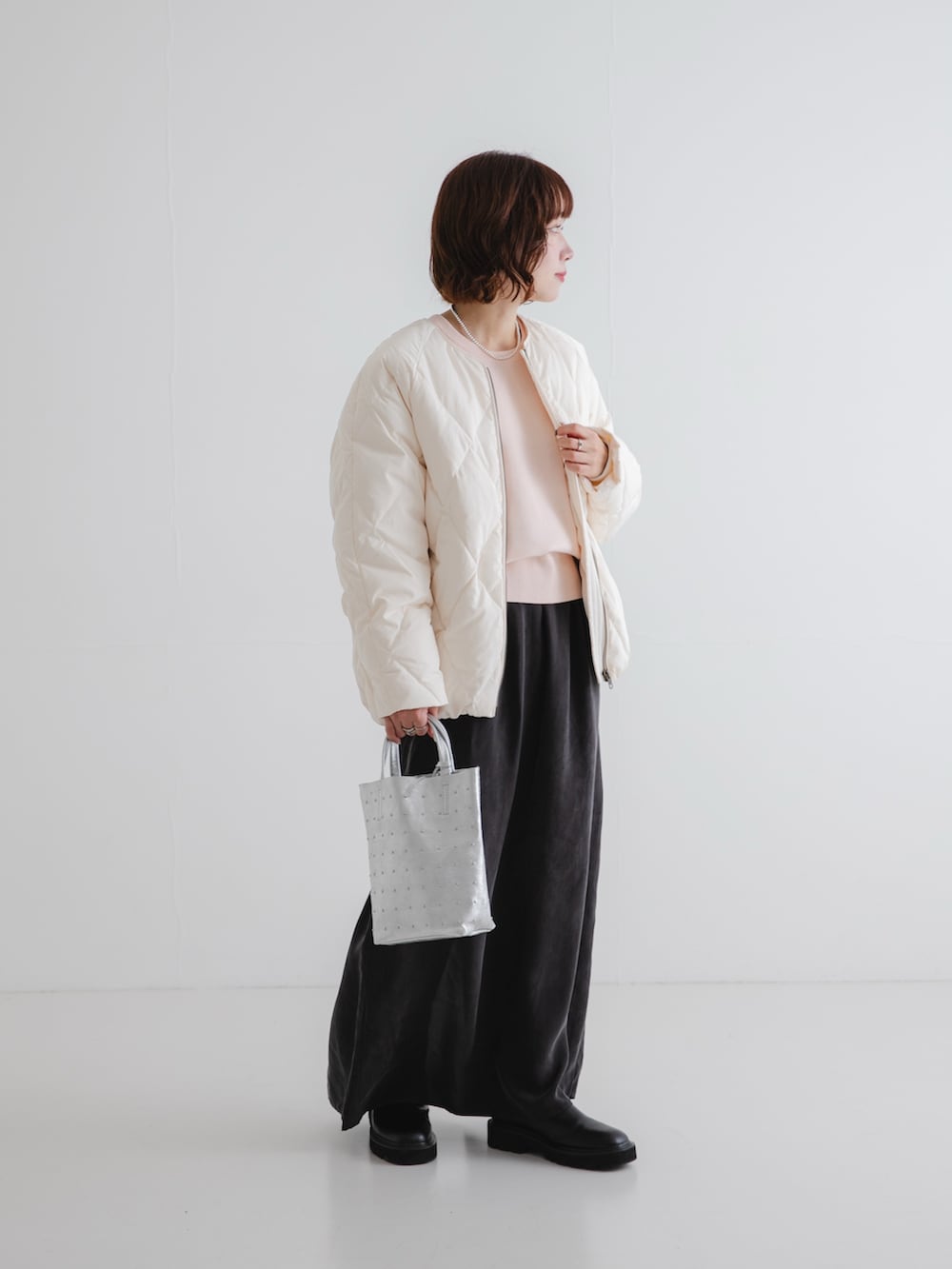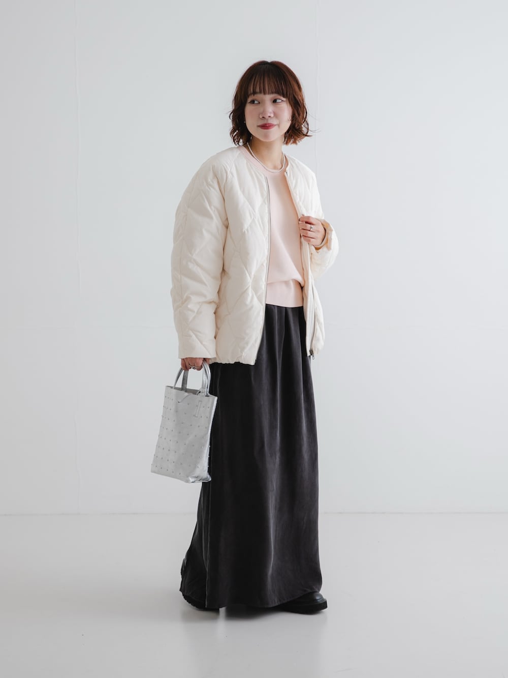 白は可愛いすぎるという方も、キルティングなのでカジュアルさもあり、コートなどに比べると甘さを抑えて着れます♩