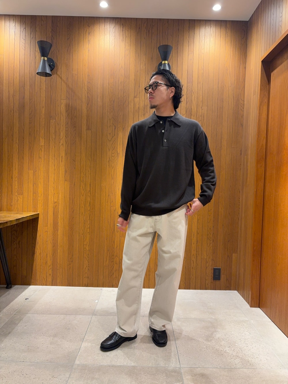 ・足元はレザーシューズで、カジュアルを引き締める