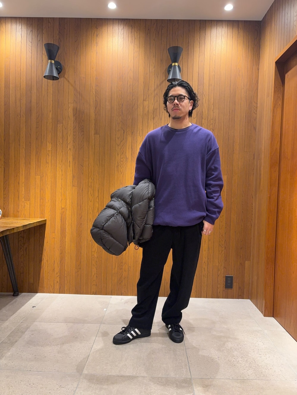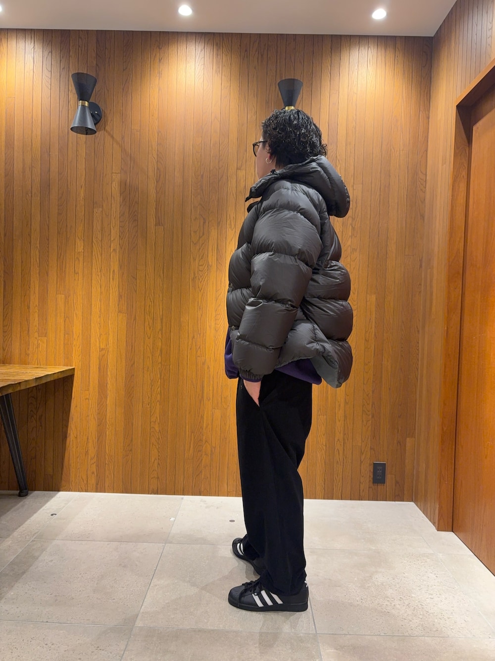・ライトダウンをさらっと羽織り、インナーはワッフルプルオーバーで程よくボリュームを