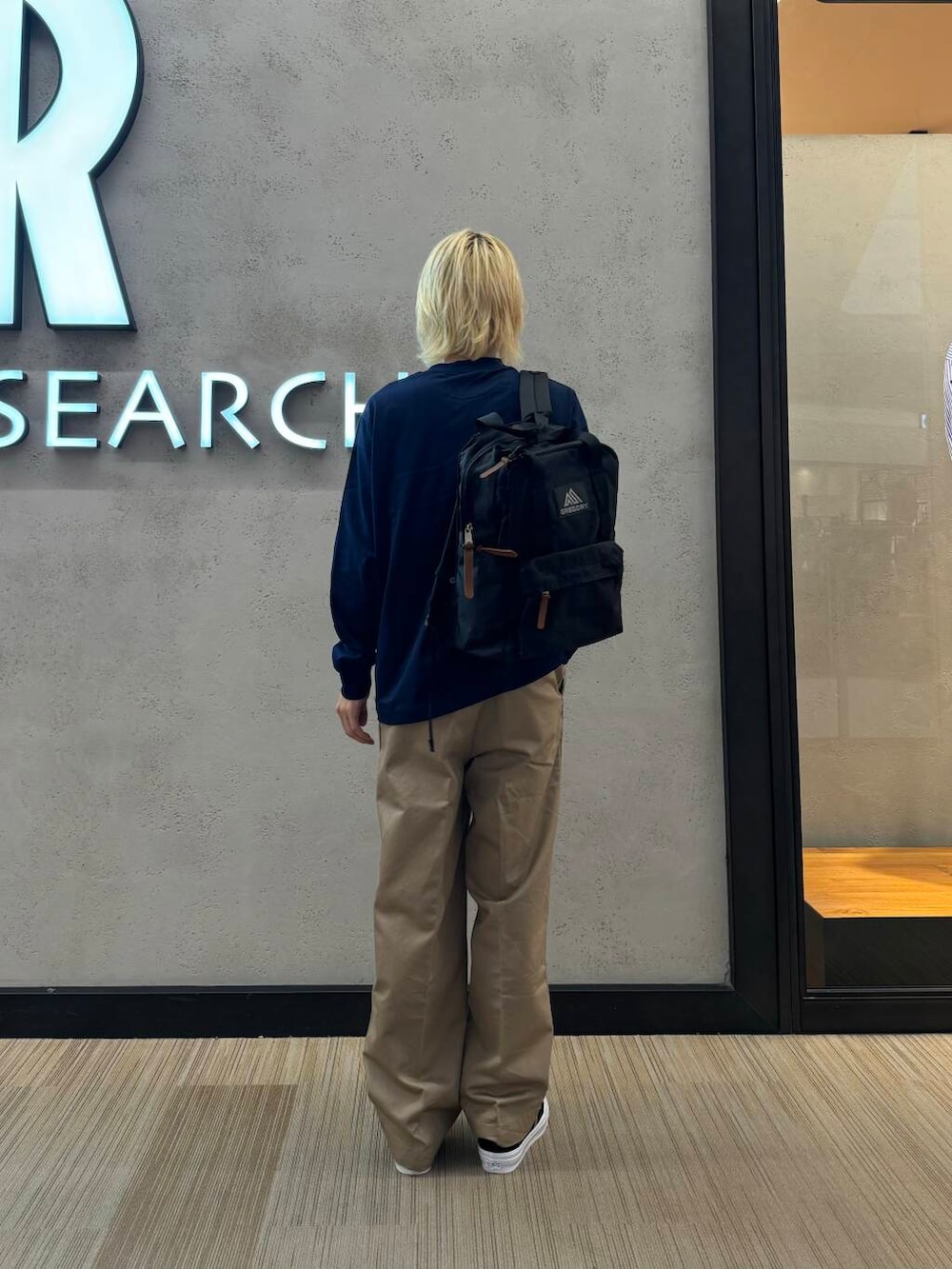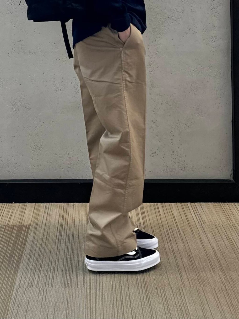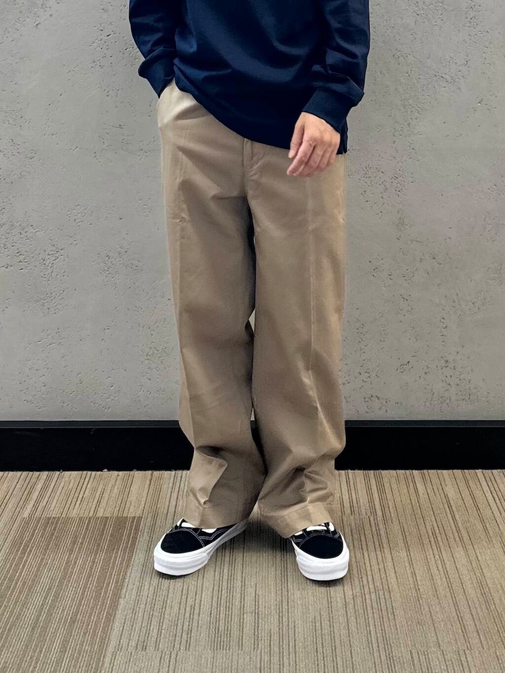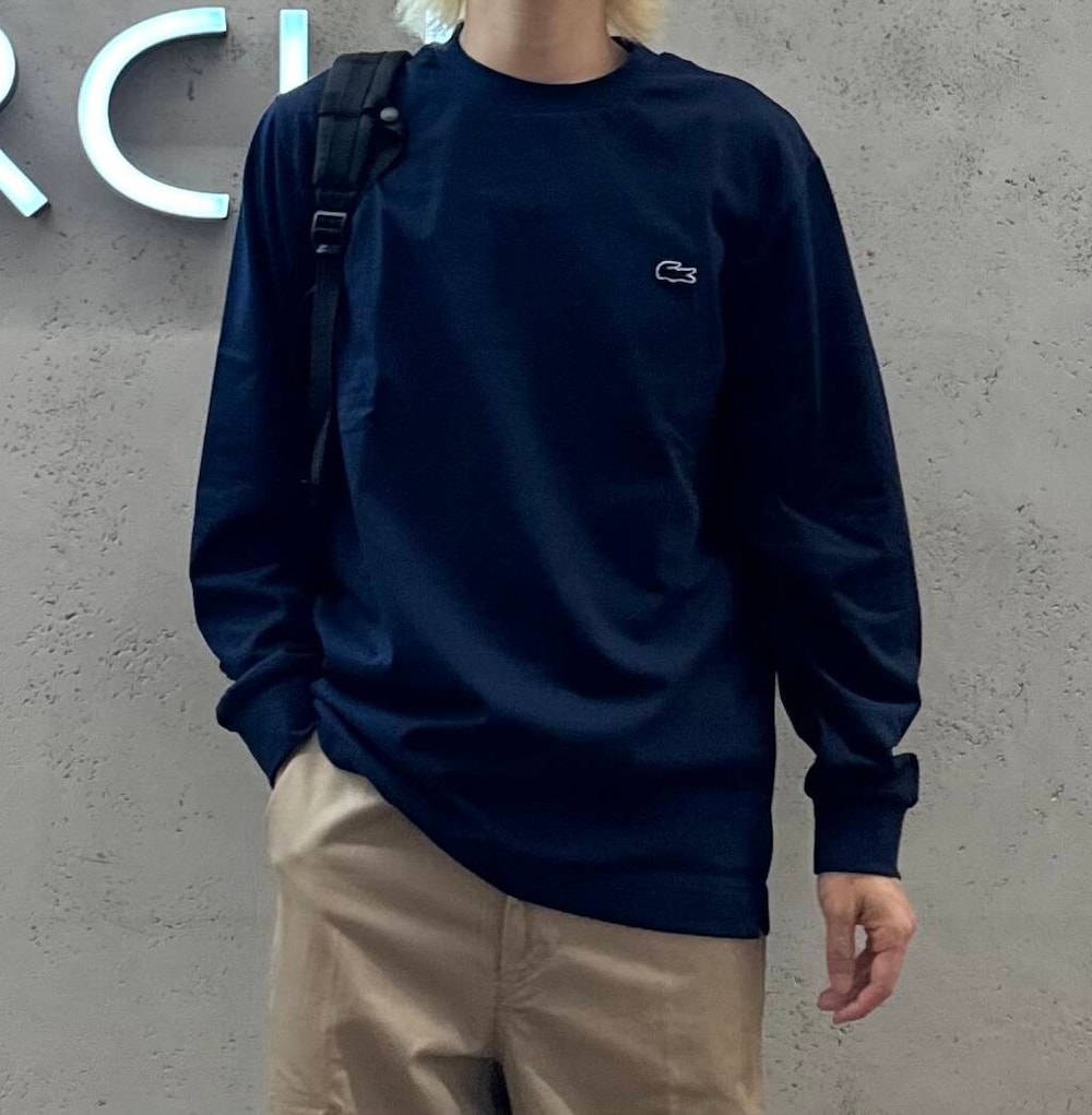 袖感にゆとりはありますが、そこまでオーバーサイズでは無くベーシックなシルエットとなってます。