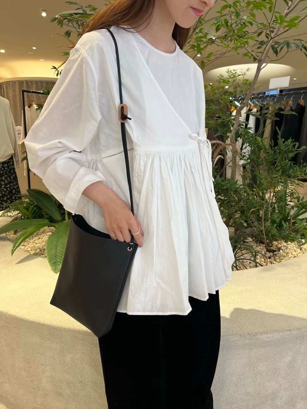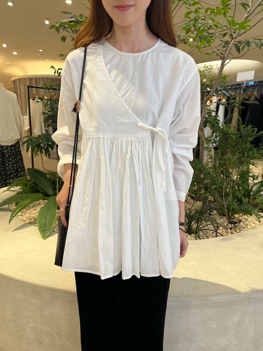 カシュクールデザインでクルーネックにもなる着方によって印象が変わるブラウスです!