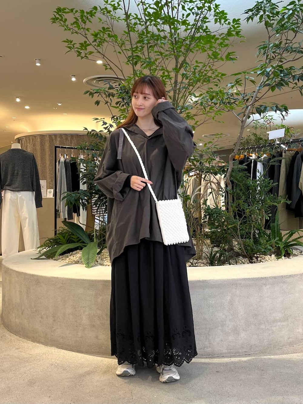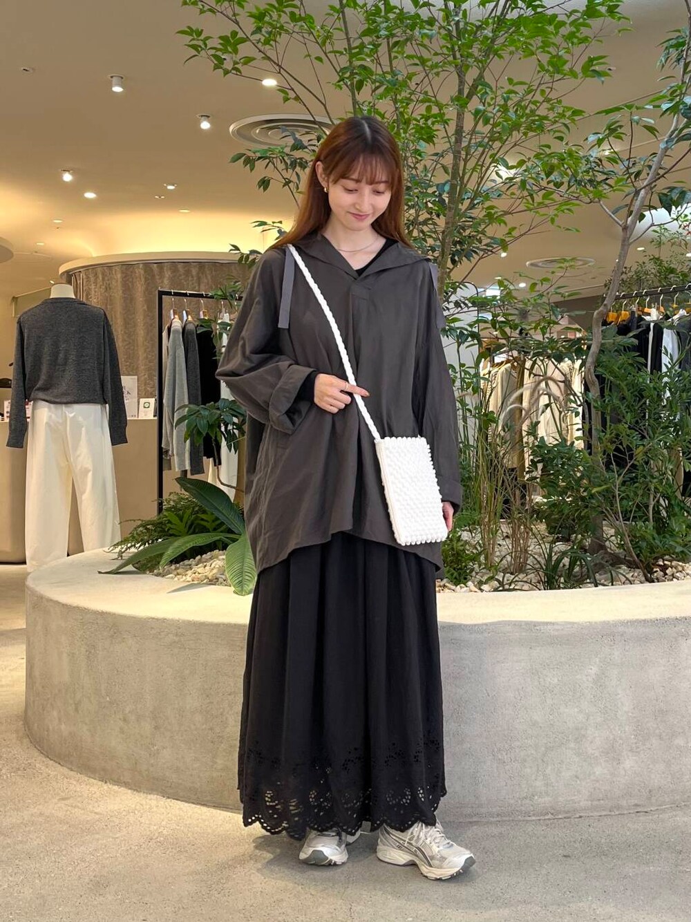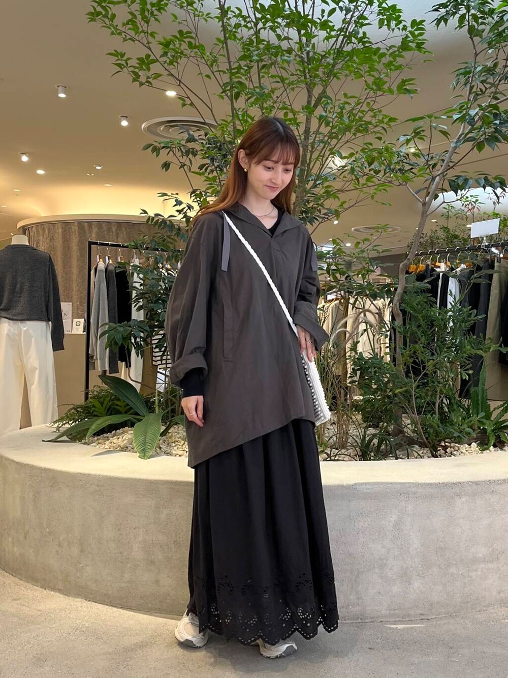 後ろ下がりなのでお尻もすっぽりと隠れる長さで、スカートやゆるっとワイドパンツと合わせるのがオススメです!