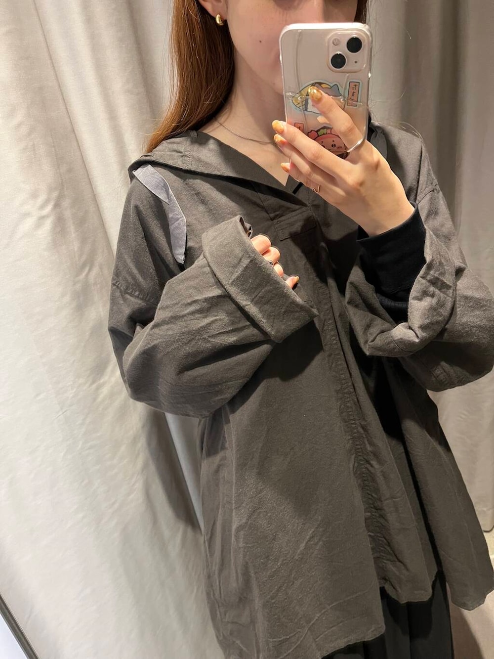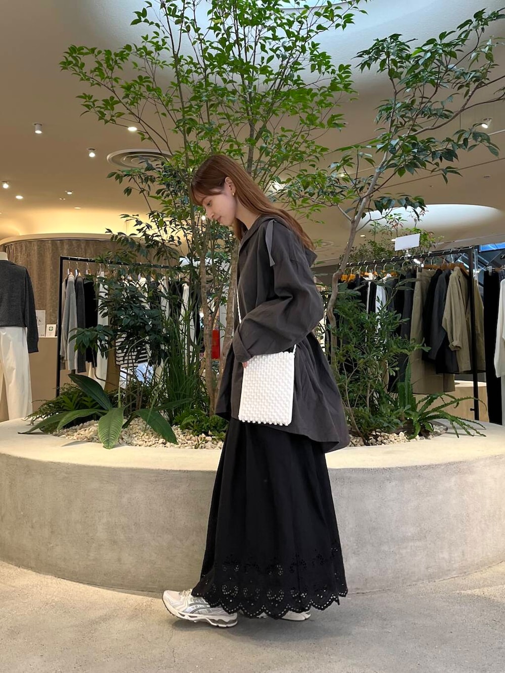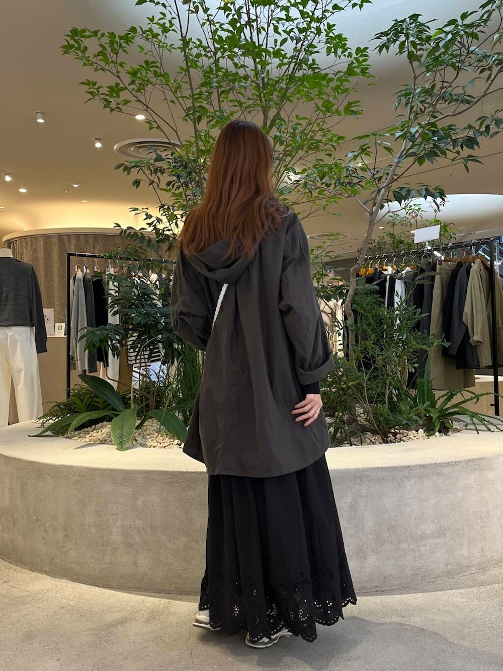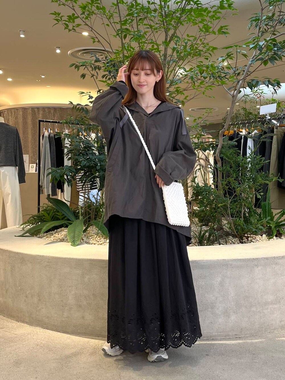 後ろ下がりなのでお尻もすっぽりと隠れる長さで、スカートやゆるっとワイドパンツと合わせるのがオススメです!