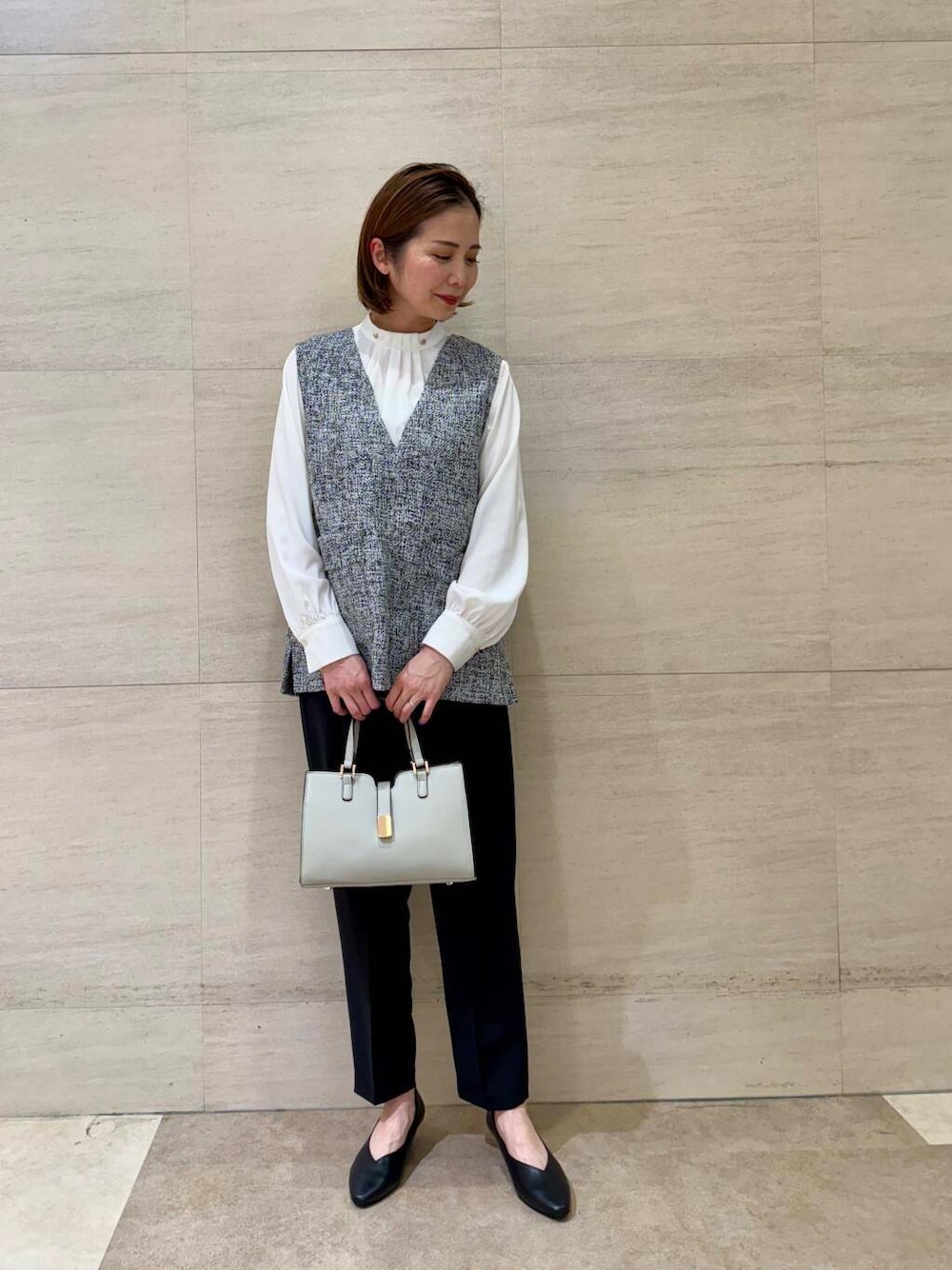 ブラウスにボタンポイントあるので、アクセサリーいらずで華やかな印象に◎