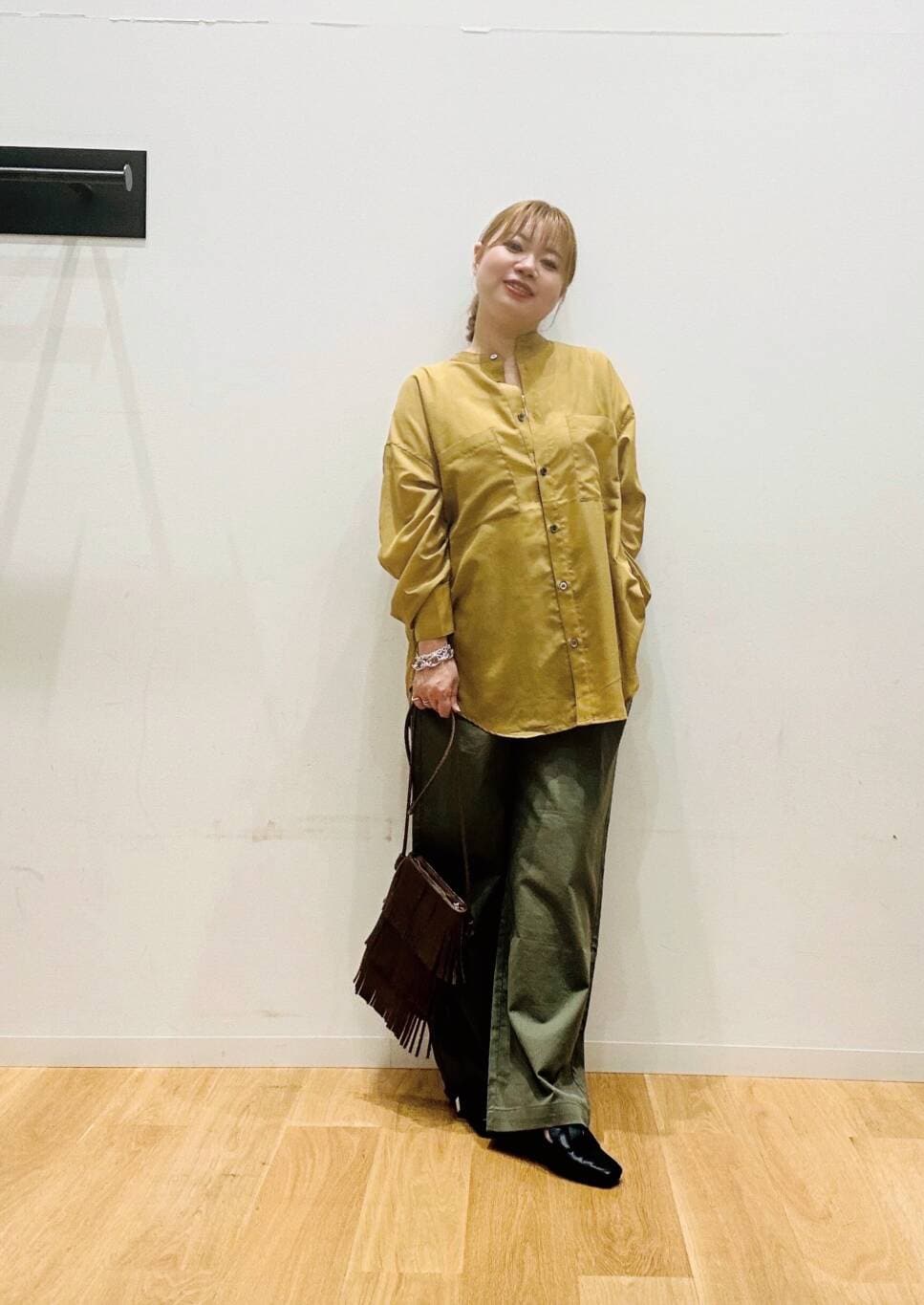 シャツはバンドカラーでカジュアルな印象に。