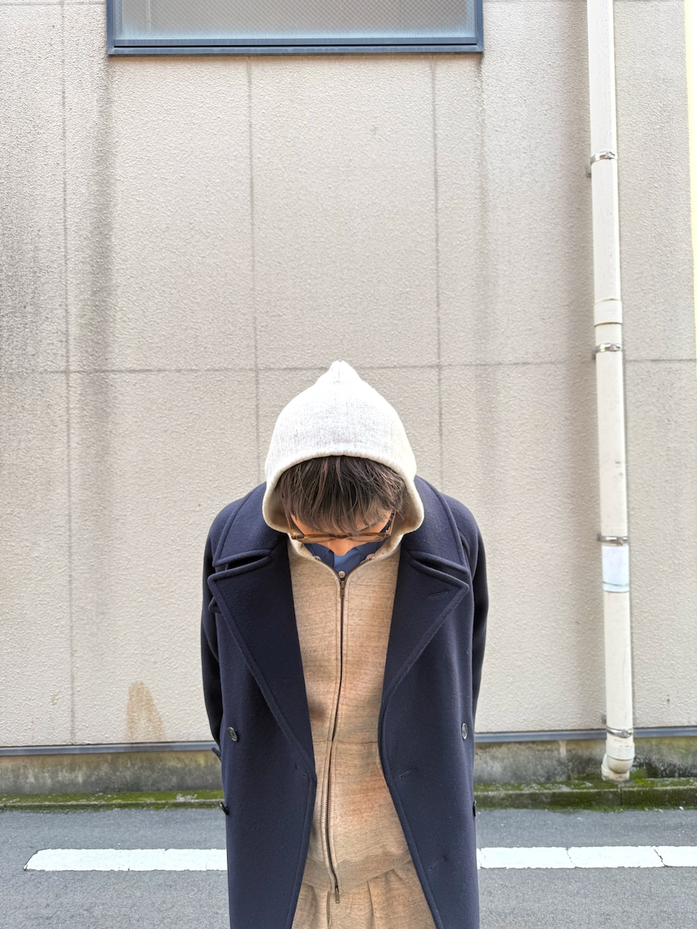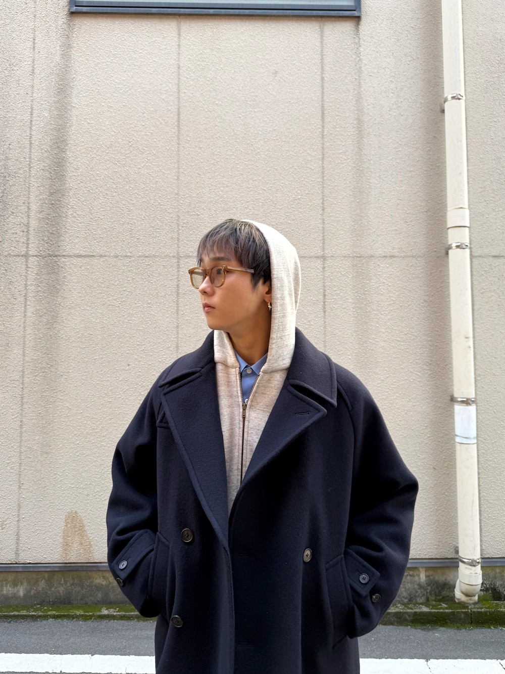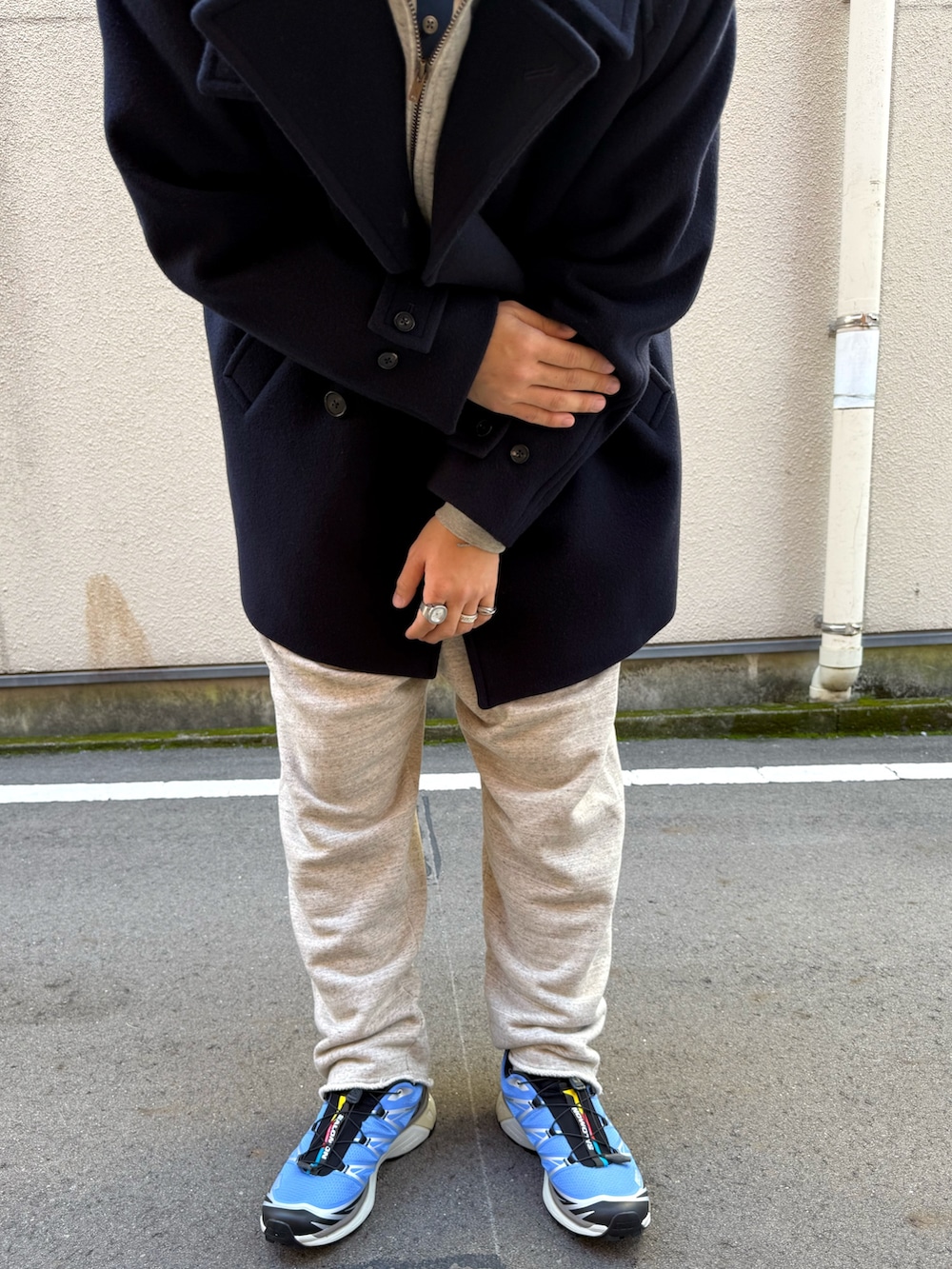 大きめなPコートは簡単にざっくり羽織れてどんな格好にも合ってくれます。