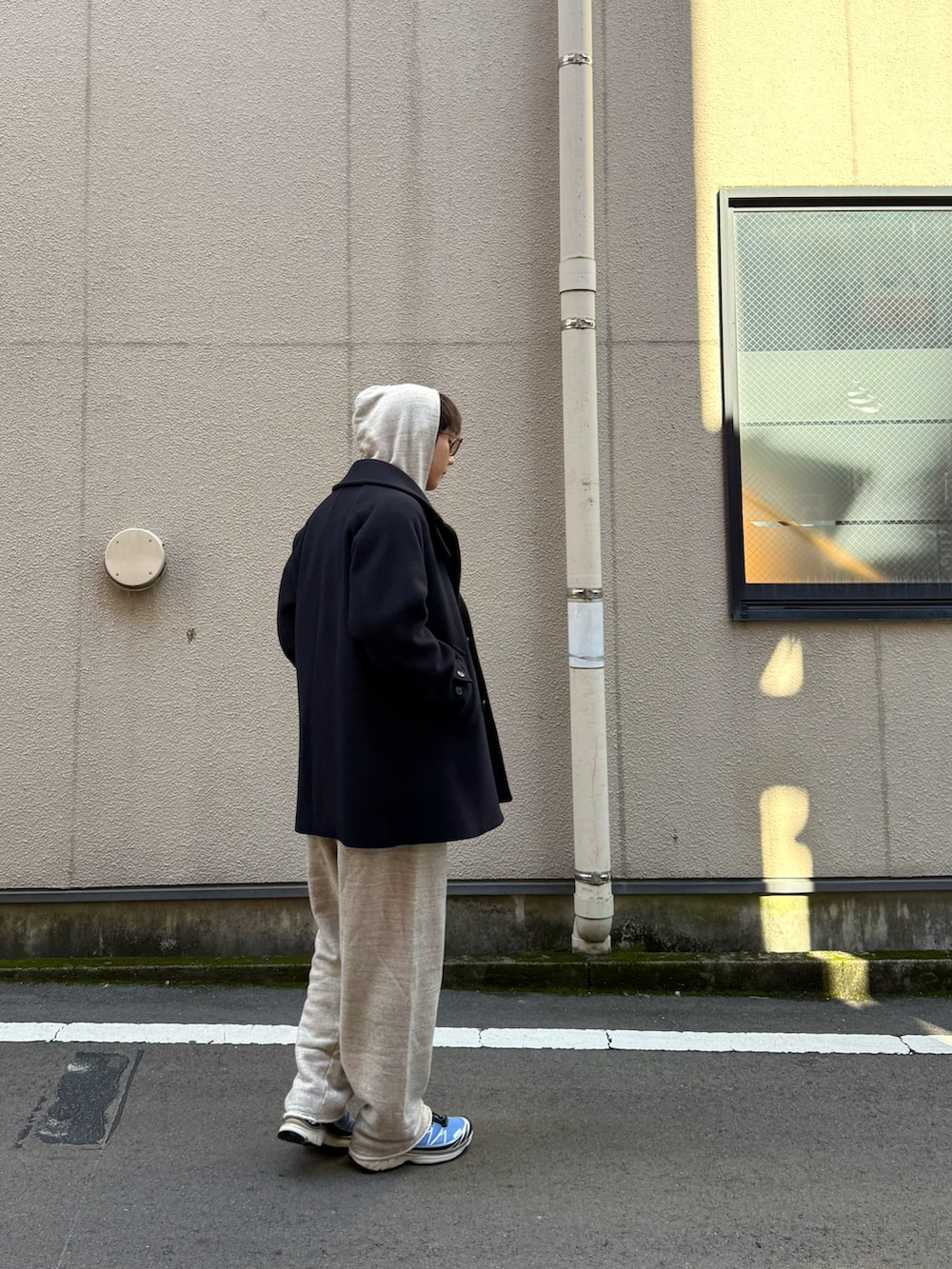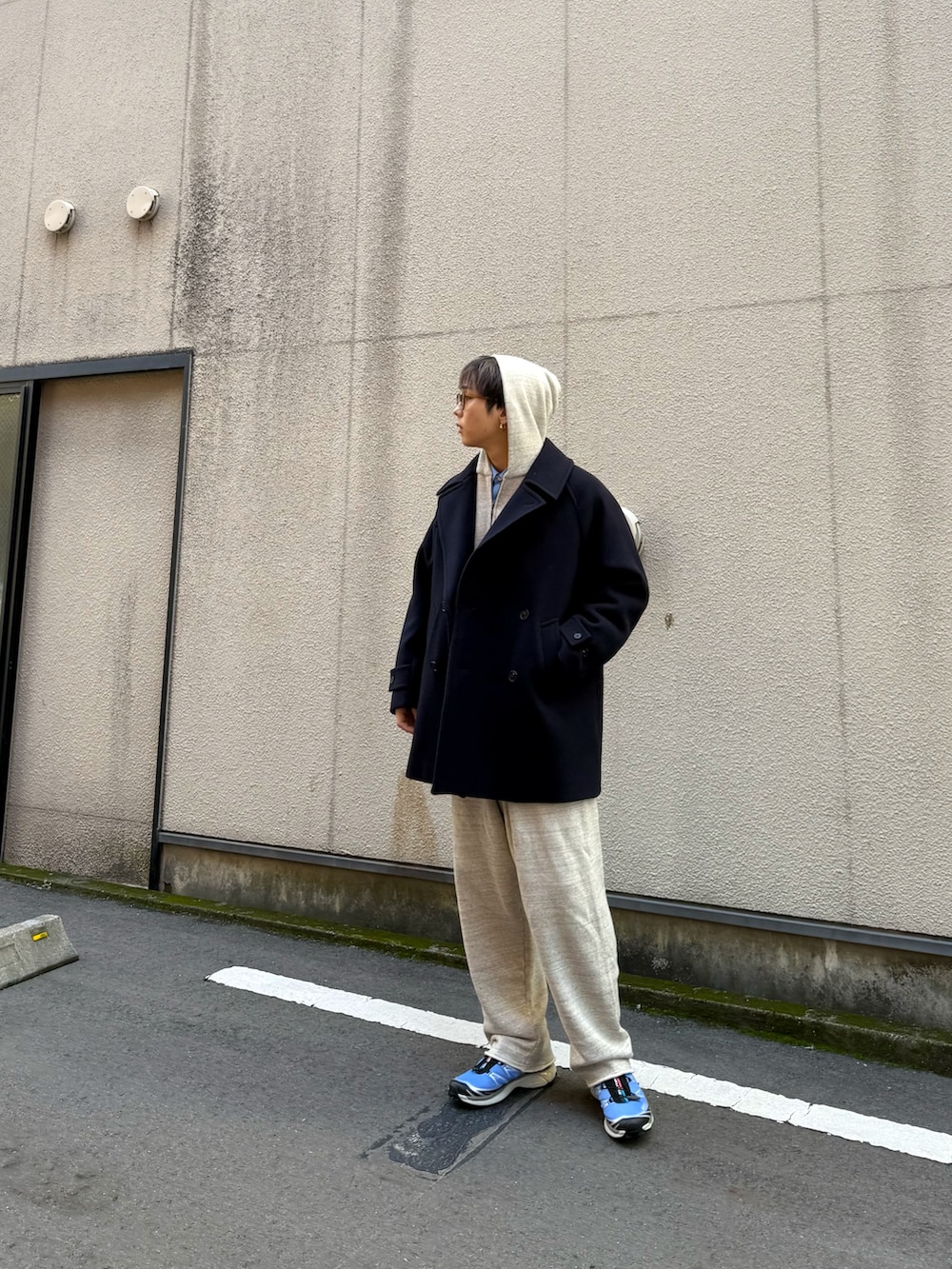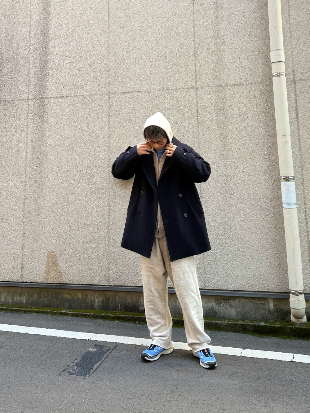大きめなPコートは簡単にざっくり羽織れてどんな格好にも合ってくれます。