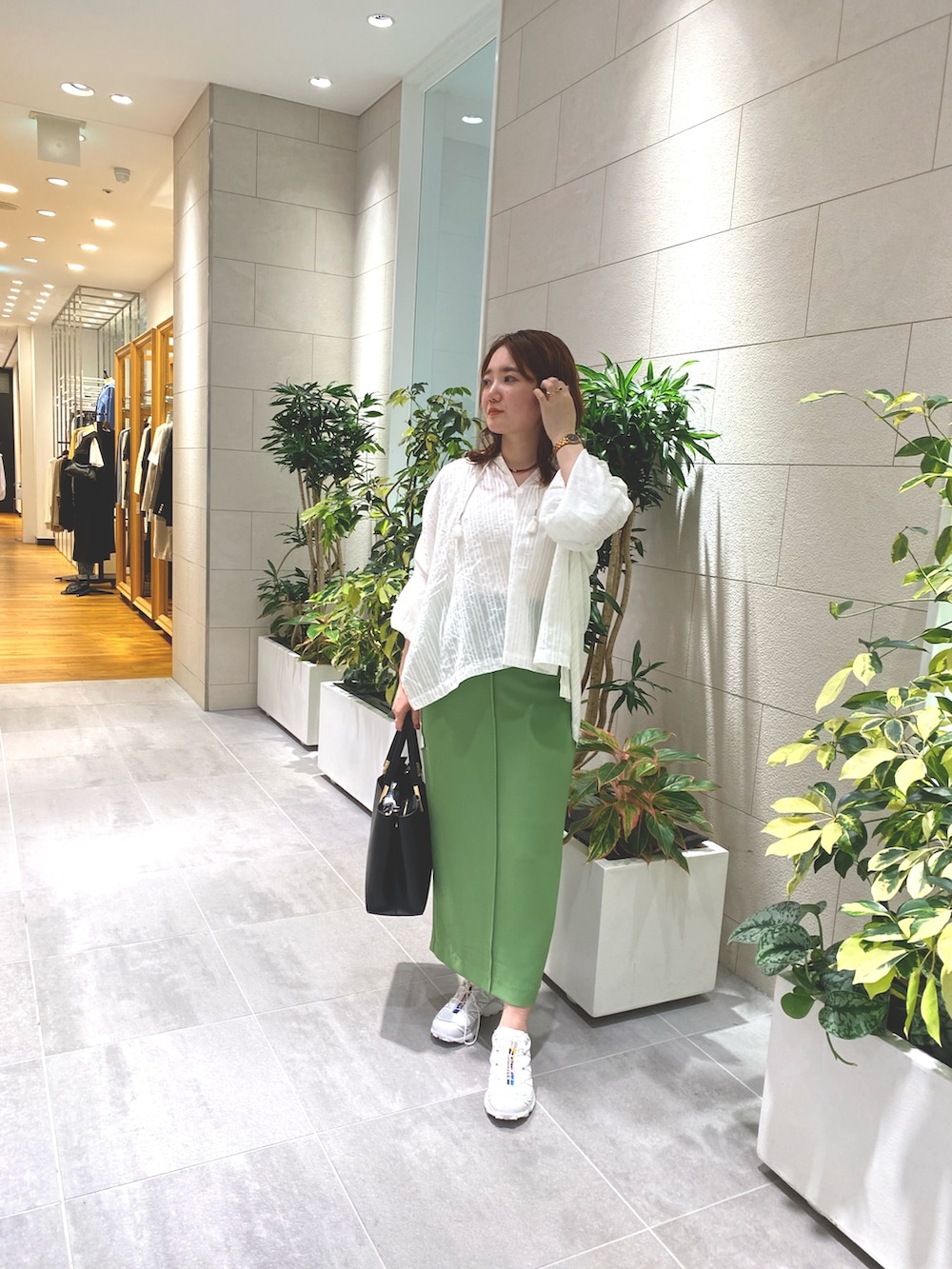 春らしい、綺麗なグリーンのタイトスカートを使ったコーディネートのご紹介です。