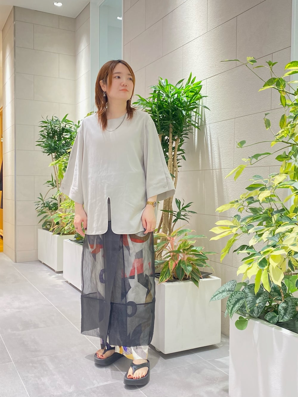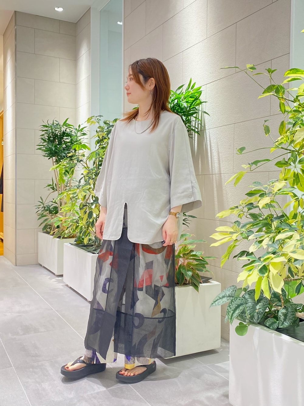 柄のパンツにはシアースカートをレイヤードして奥行き感を出してみました。