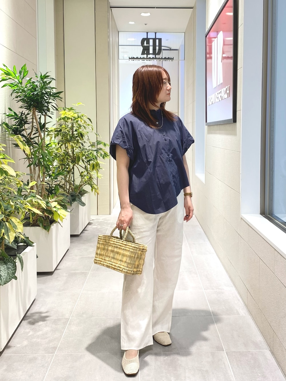 ネイビーのブラウスは、アシンメトリーな裾が白のパンツに映えて◎。