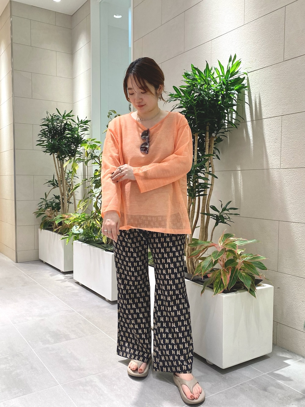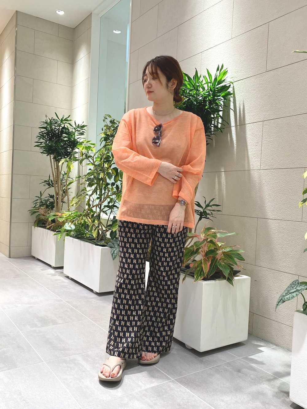 リネン混のドライタッチな素材感で涼しく着ていただけます。夏らしいオレンジのカラーがとてもかわいいです♪