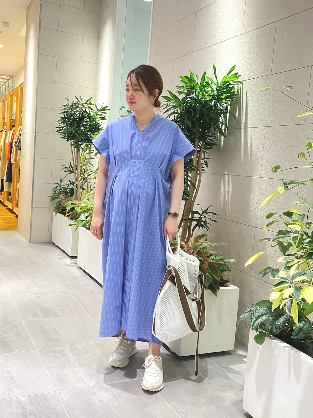 身幅はしっかりありますが、ウエストにはタックが入っており、さりげない立体感でスタイルアップ効果◎。Vネックやゆったりしたフレンチスリーブで涼しく着用いただけます。