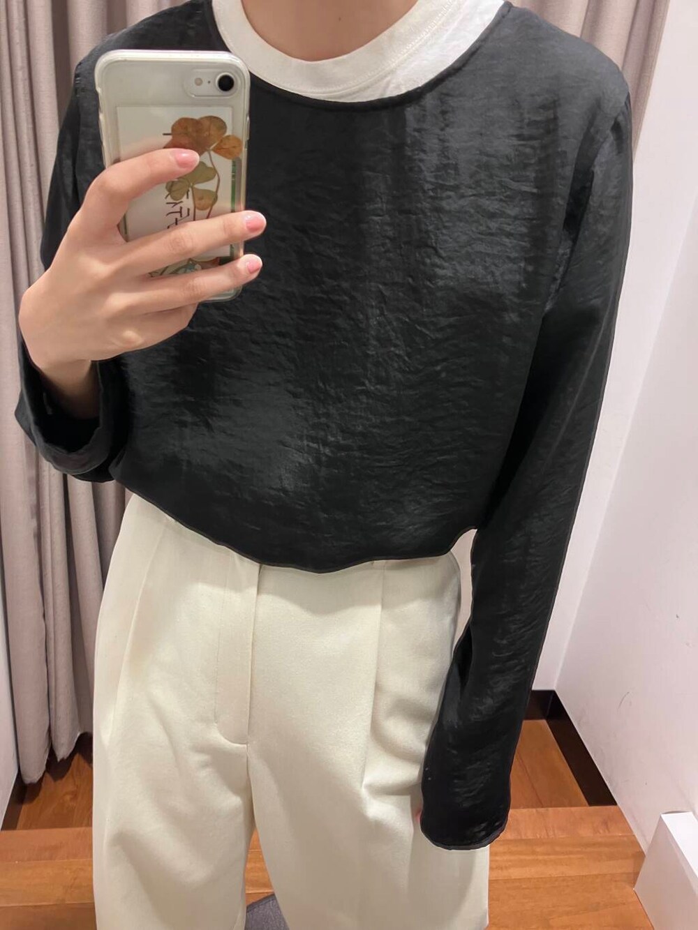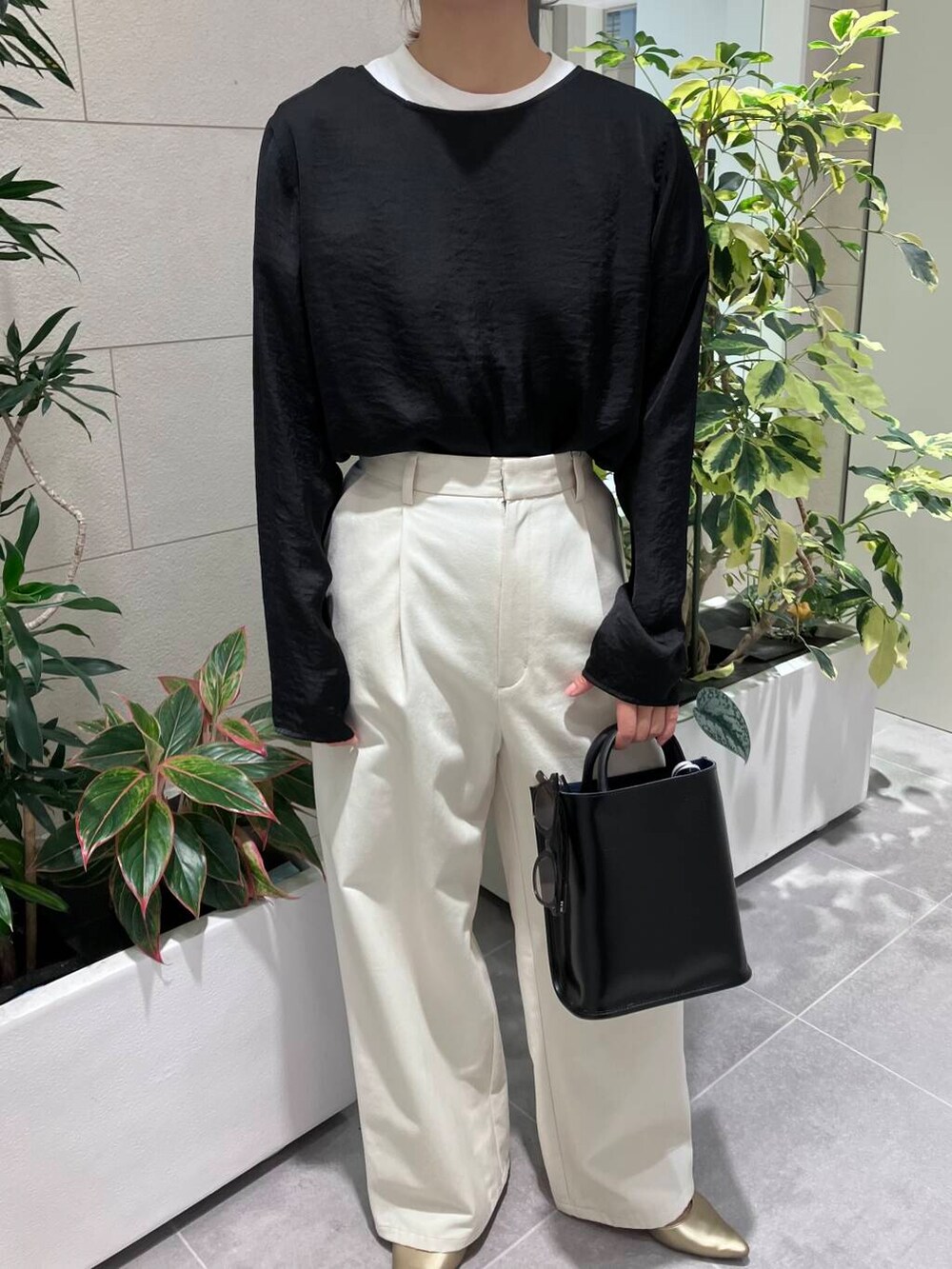 サテンブラウスのインナーにTシャツをきて少しラフ感をプラスするのも○