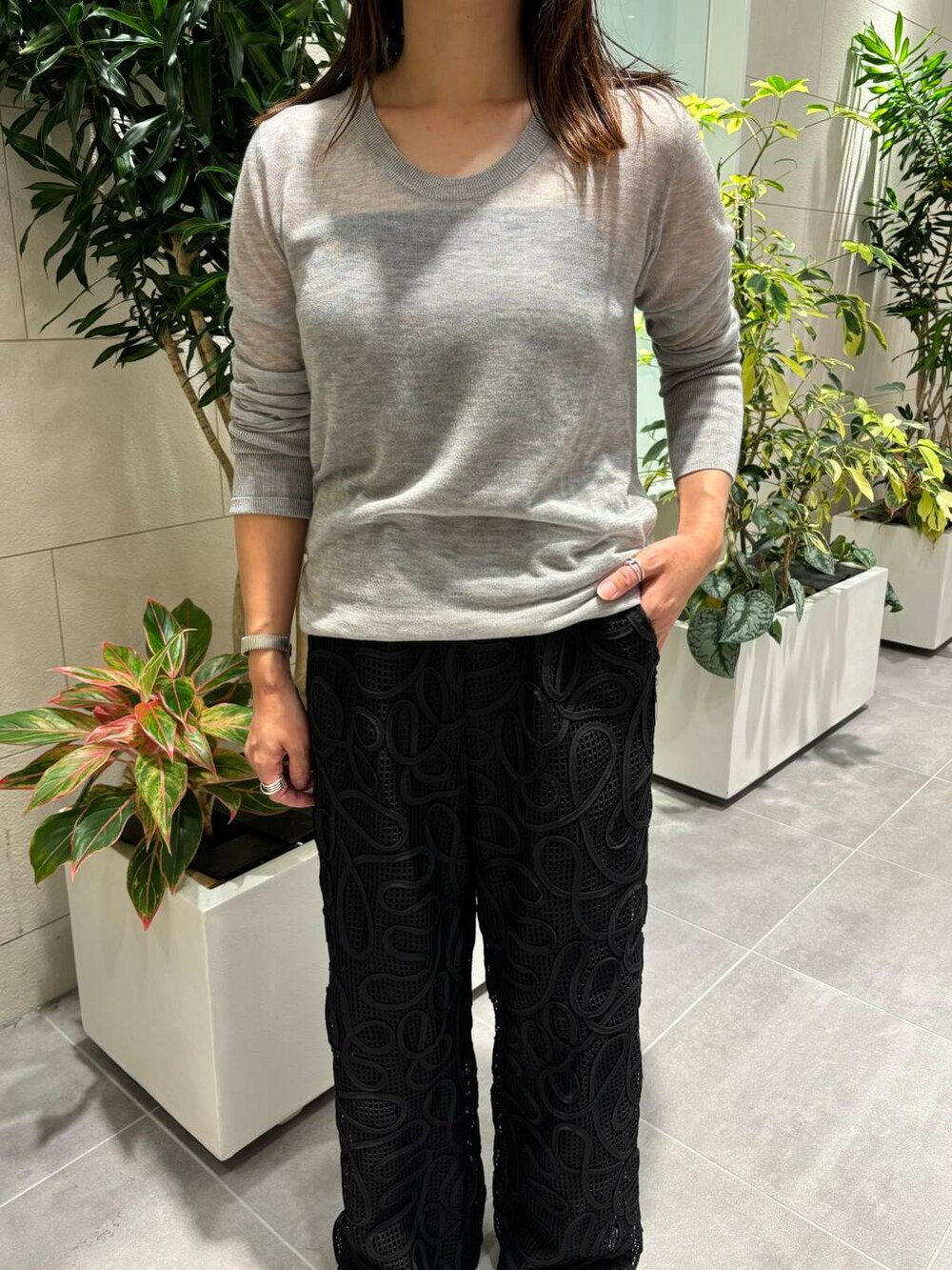 柔らかく、滑らかな着心地抜群のニットは透け感があるのでいまの時期にちょうど1枚でお召しいただけます^^