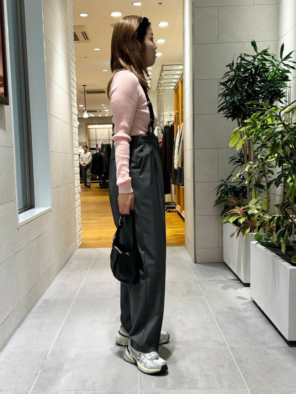 コンパクトなカーディガンなので、ボトムスはストレートのワイドパンツで合わせてみました!