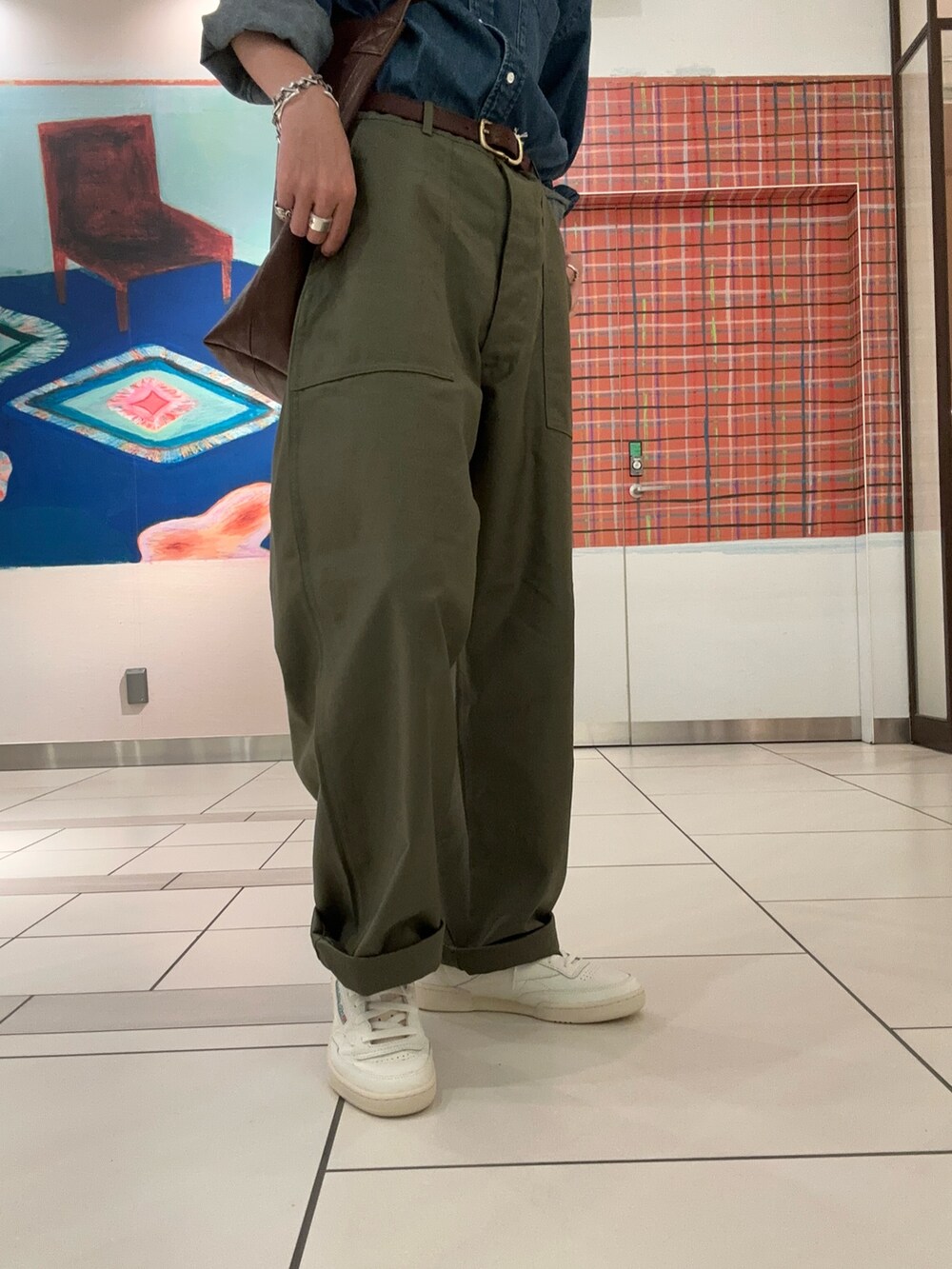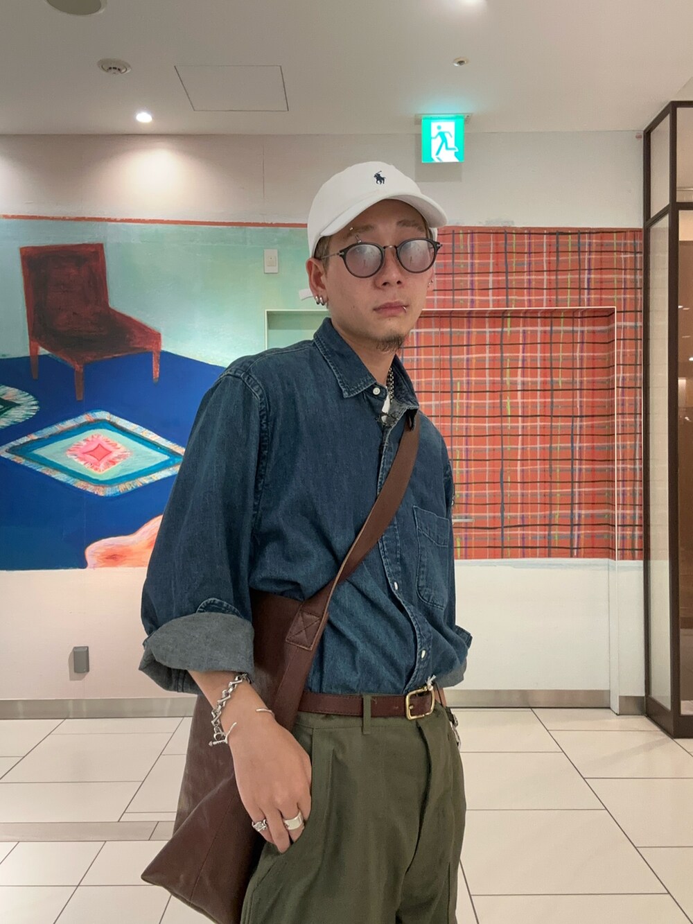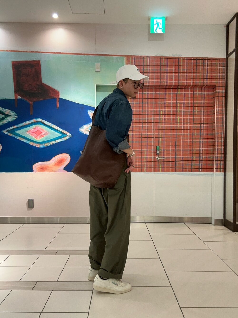 今回はデニムシャツを主役にしたコーディネートを組みました。ボトムスにはCIOTAのバギーパンツを合わせ、全体的にアメカジの雰囲気を強めています。ただ、レザーバッグと白いキャップを取り入れることで、清潔感をプラスしつつ、キレイめな要素も加えました。コーデの中心はアメカジなので、足元はクリーム色のヴィンテージ感が漂うReebokのスニーカーを選び、全体のバランスをとりました。