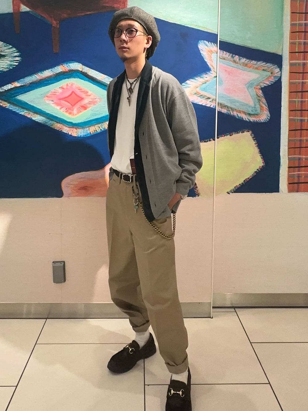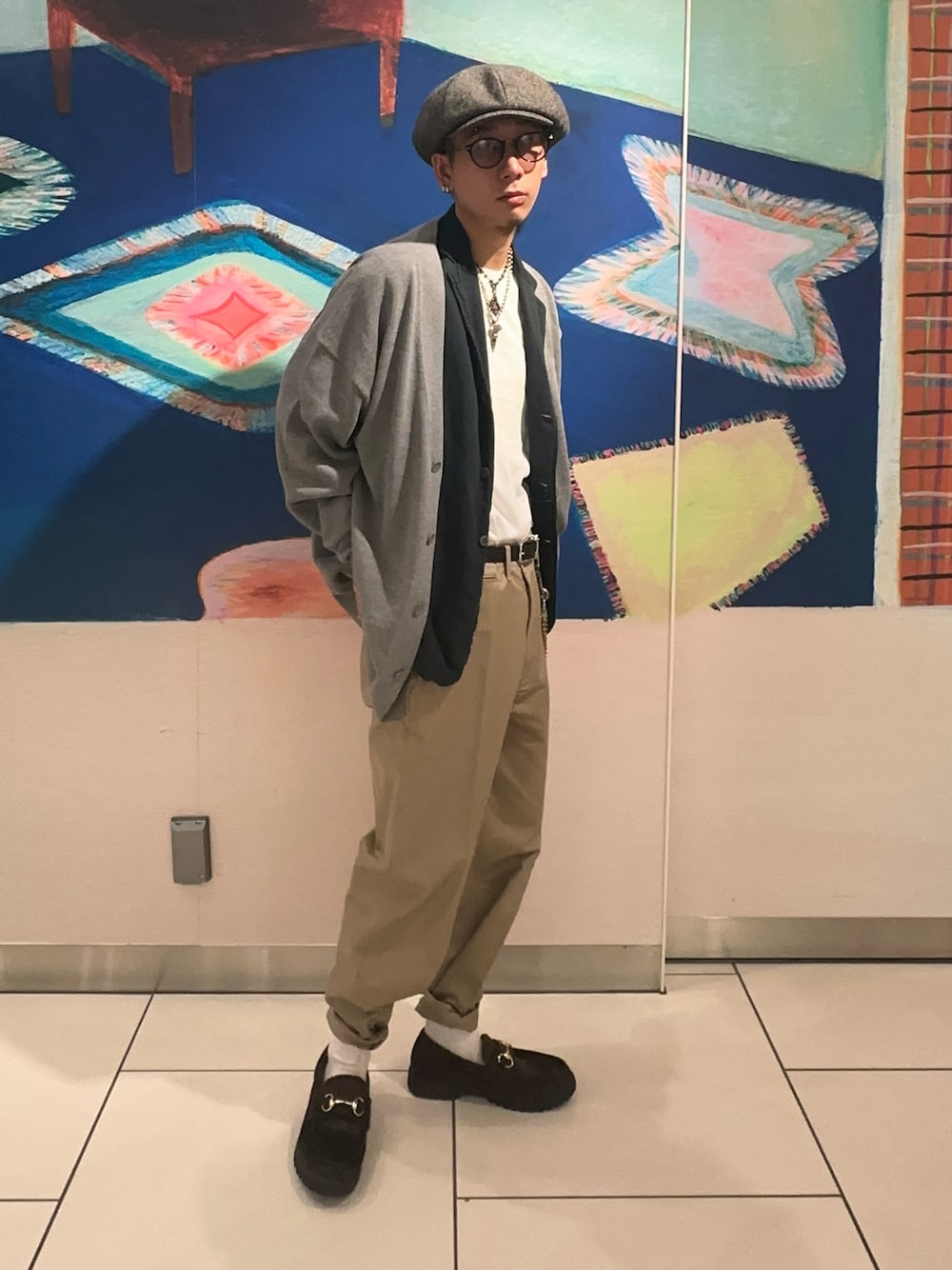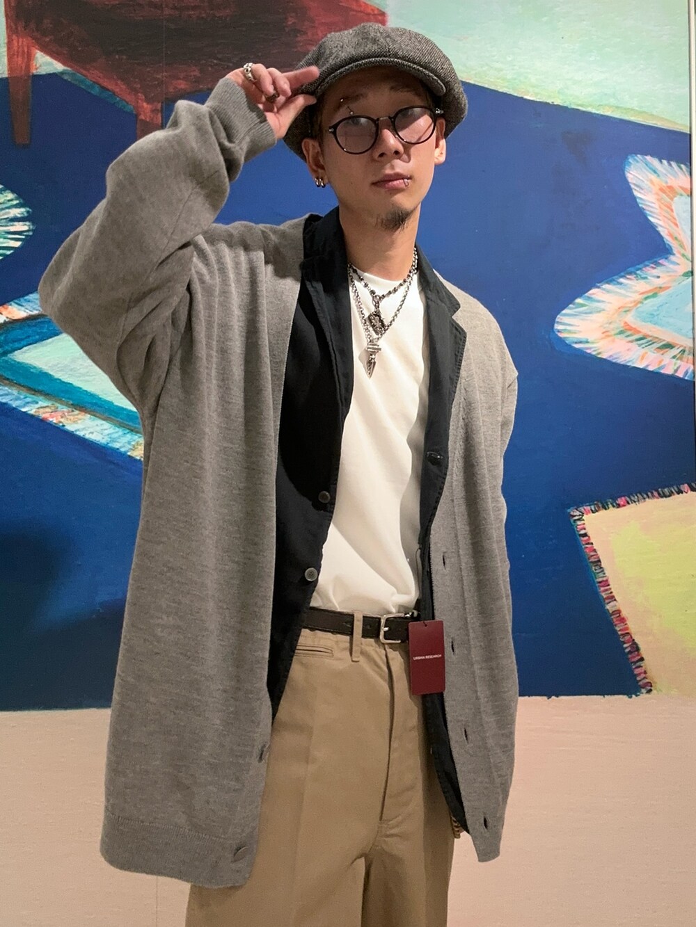 ただし、白のロンTとグレーのカーディガンをそのまま隣り合わせにすると、色が似ていて識別しにくくなるため、その間にデニムのオーバーダイジャケットを挟むことで、アイテムの識別性を高めました。これにより、全体のコーディネートに深みを加え、世界観をより強調する効果があります。