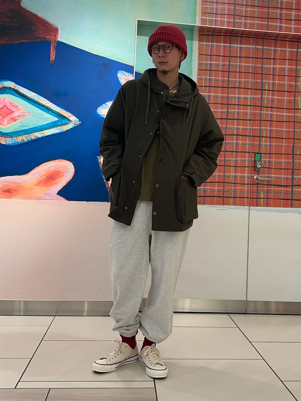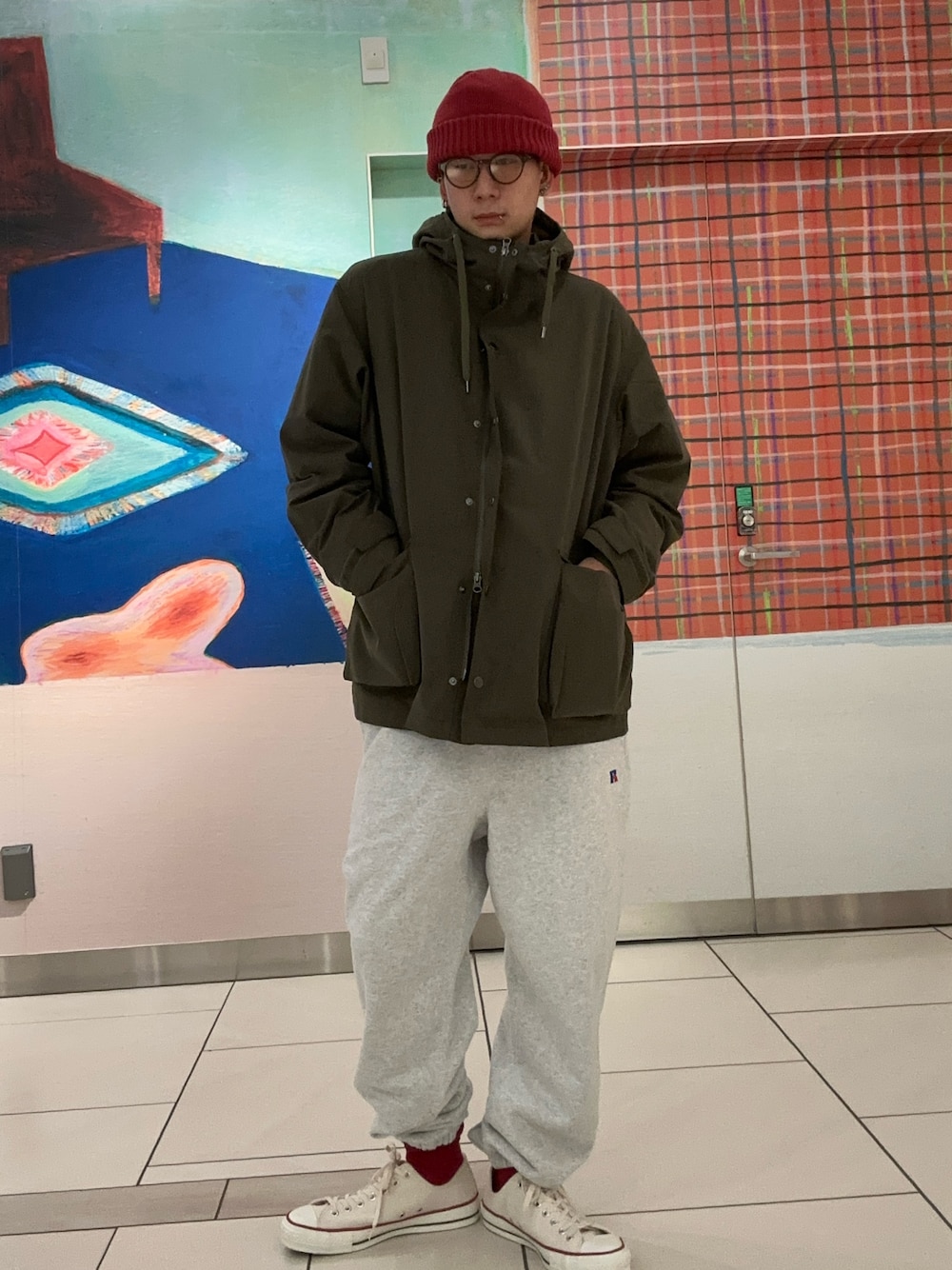 TAIONの3wayミリタリージャケットをメインに、かなりラフなコーディネートを組みました。ボトムスにはラッセルのスウェットパンツを合わせています。スウェットパンツを合わせるとパジャマっぽく見えてしまうことがありますが、これは家で着るイメージが強いためだと思います。そこで、パジャマっぽさを避けるためには、家の中では使わないアイテムを取り入れることが有効です。