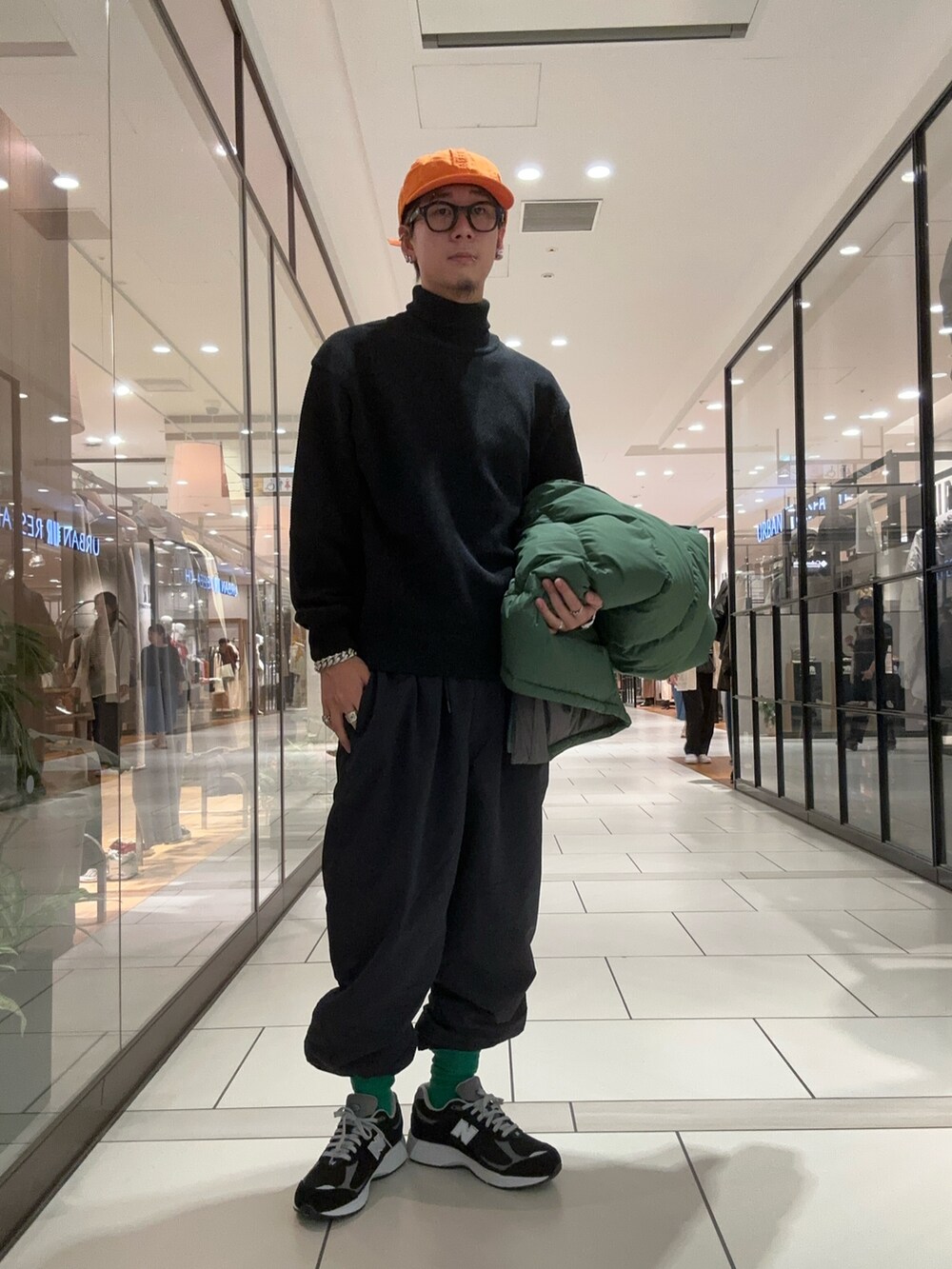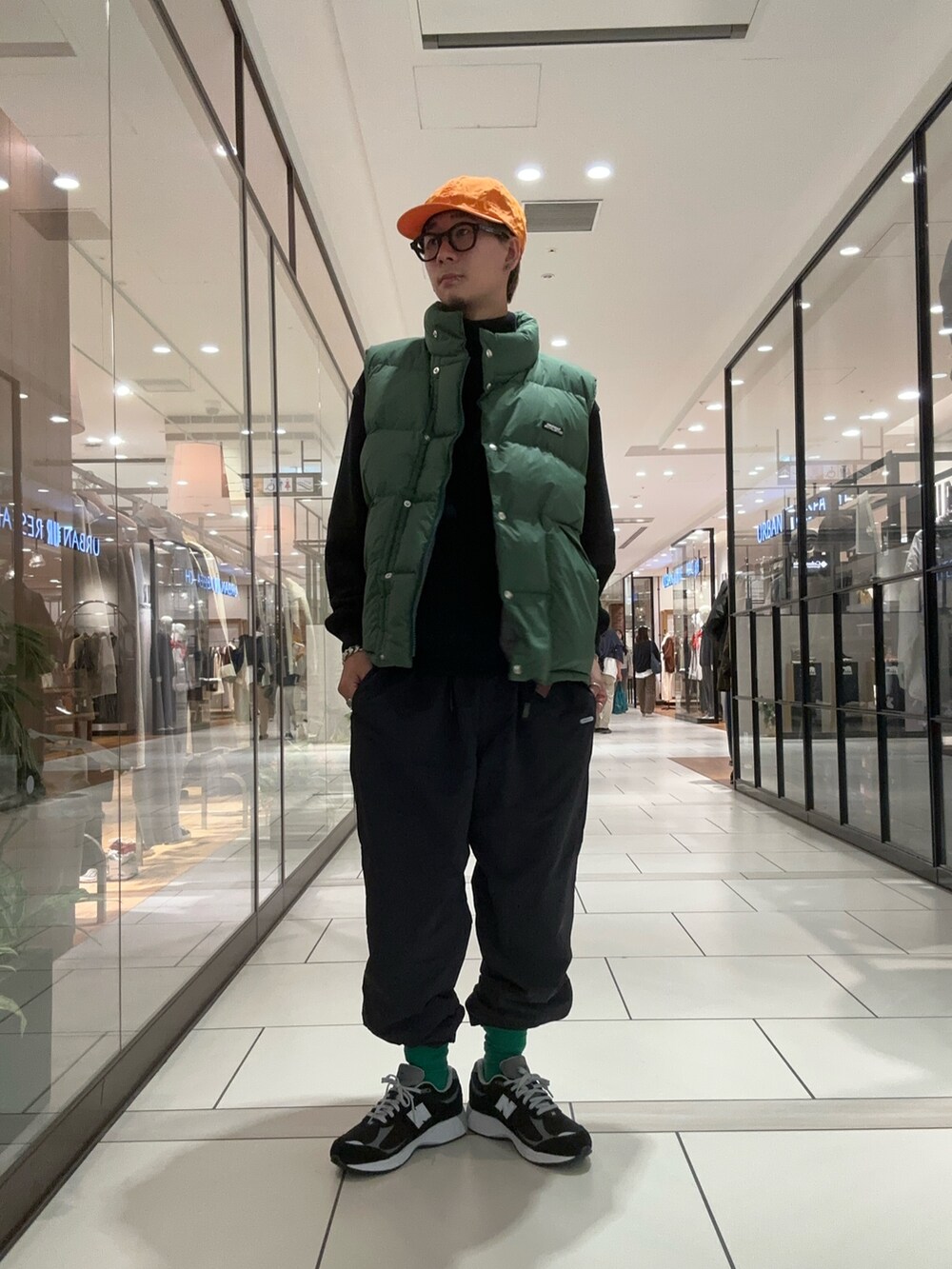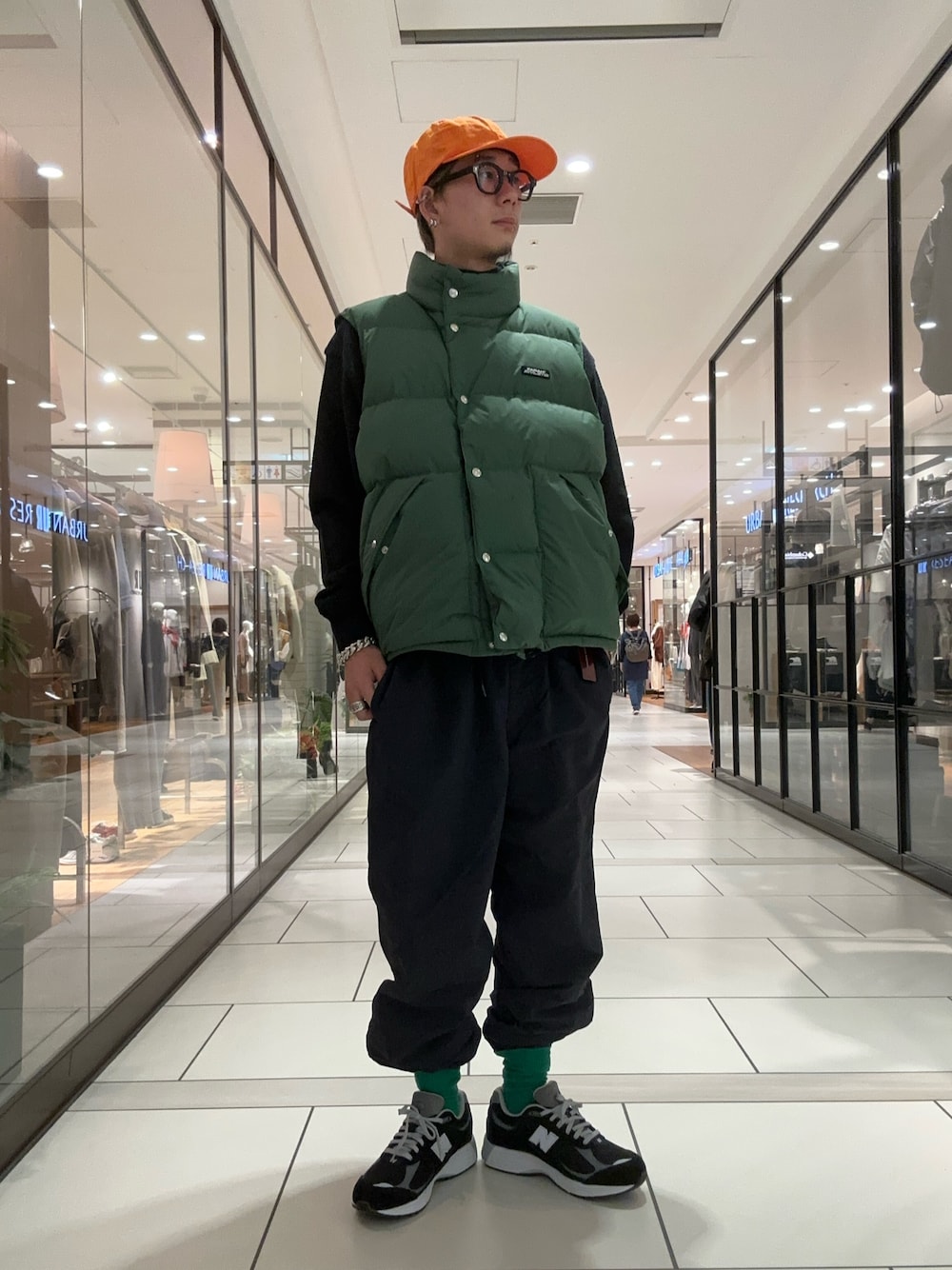 グリーンのダウンベストを主役にし、オレンジのキャップでポップなアクセントをプラスしました。黒のトップスとパンツで全体を引き締めつつ、足元にはブラックとホワイトのスニーカーを選び、グリーンのソックスで統一感を演出しています。