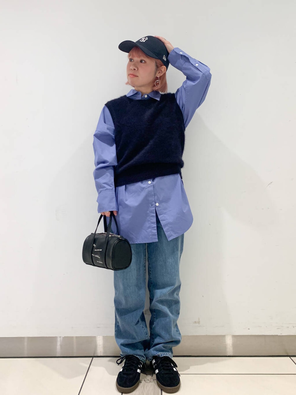 ゆったりオーバーシャツにコンパクトなベストを合わせると