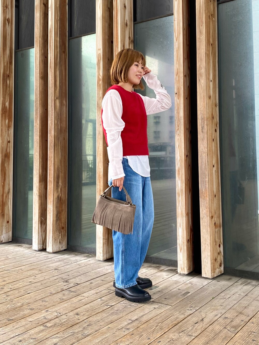 パキッとしたREDがコーデの主役になり、