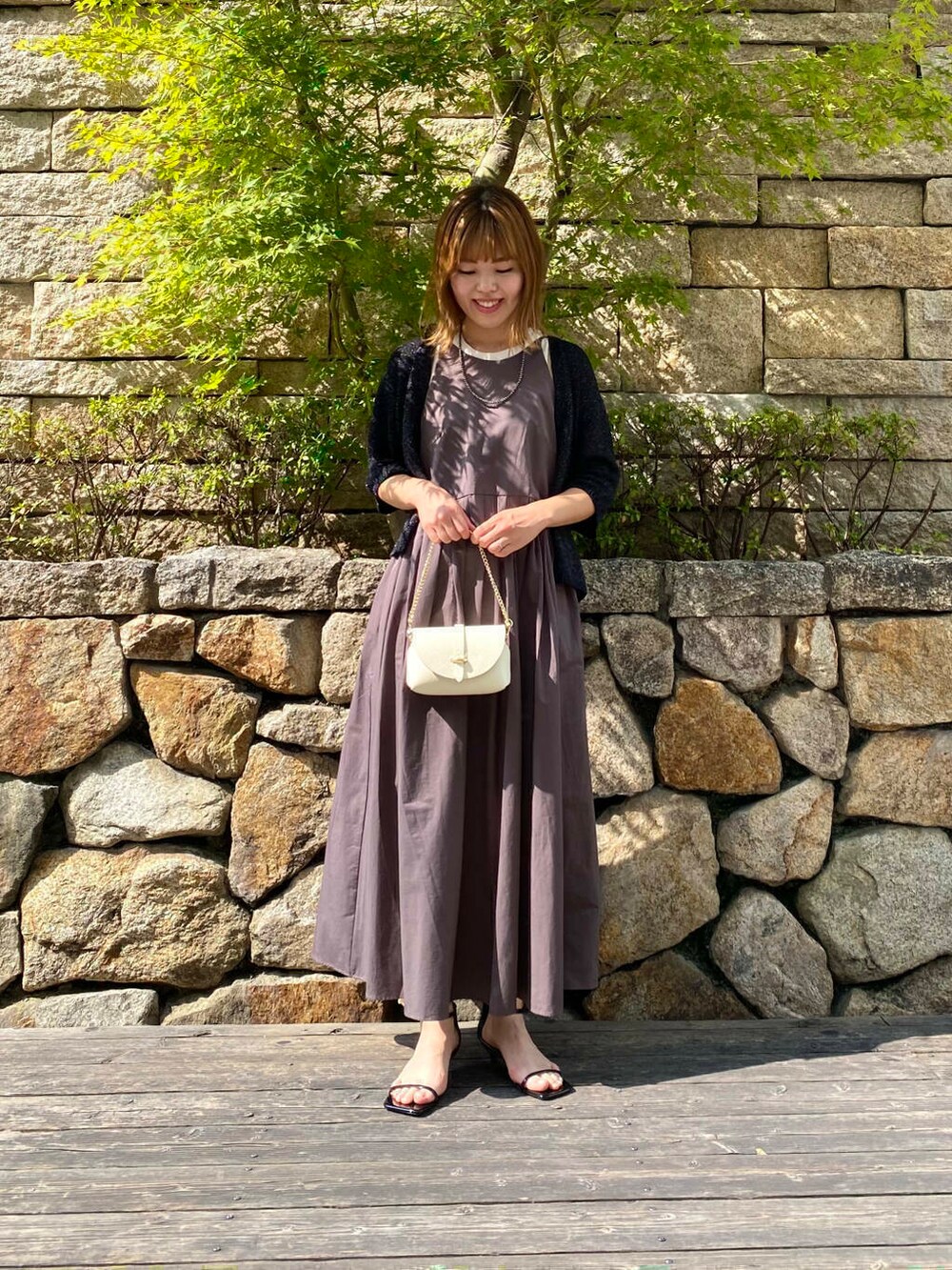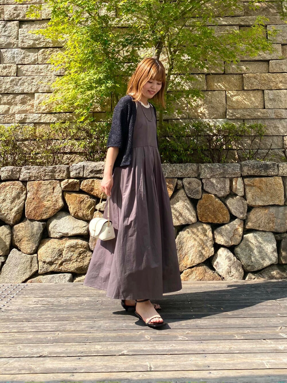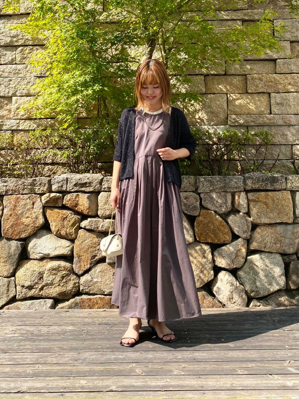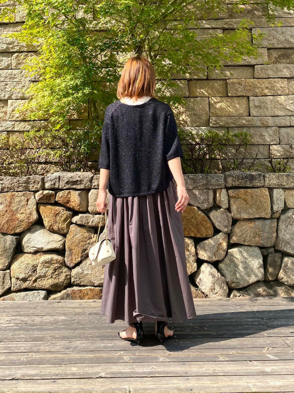 ハーフスリーブラメブークレカーディガンを合わせて